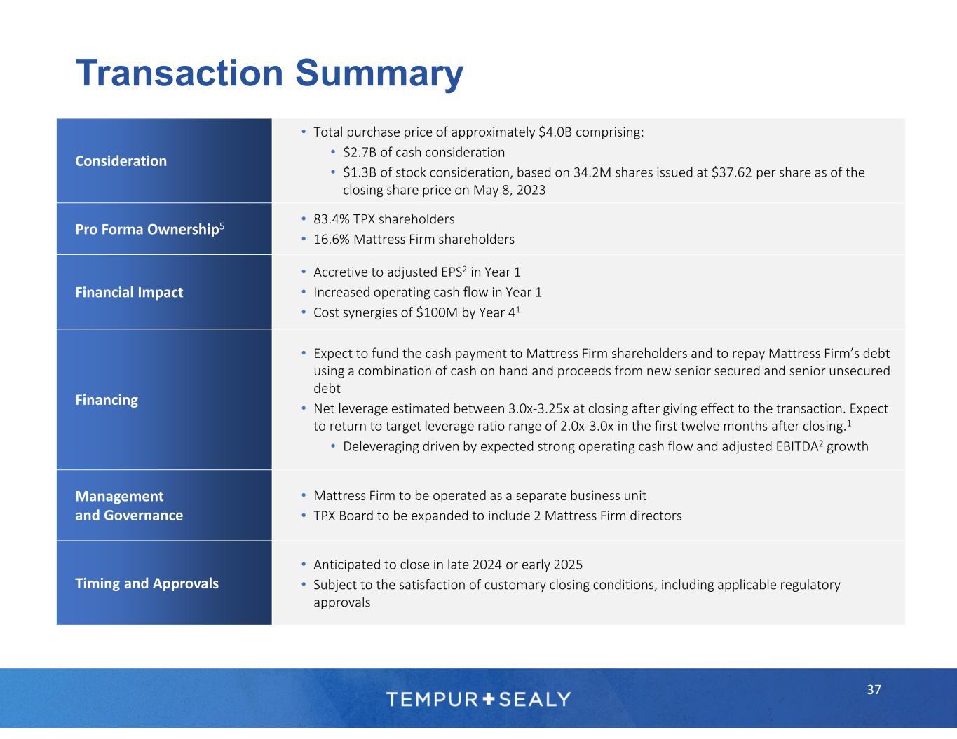 • Total purchase price of approximately $4.0B comprising: • $2.7B of cash consideration • $1.3B of stock consideration, based on 34.2M shares issued at $37.62 per share as of the  closing share price on May 8, 2023 Consideration • 83.4% TPX shareholders  • 16.6% Mattress Firm shareholders Pro Forma Ownership5 • Accretive to adjusted EPS2 in Year 1 • Increased operating cash flow in Year 1 • Cost synergies of $100M by Year 41 Financial Impact • Expect to fund the cash payment to Mattress Firm shareholders and to repay Mattress Firm’s debt  using a combination of cash on hand and proceeds from new senior secured and senior unsecured  debt  • Net leverage estimated between 3.0x‐3.25x at closing after giving effect to the transaction. Expect  to return to target leverage ratio range of 2.0x‐3.0x in the first twelve months after closing.1 • Deleveraging driven by expected strong operating cash flow and adjusted EBITDA2 growth Financing • Mattress Firm to be operated as a separate business unit • TPX Board to be expanded to include 2 Mattress Firm directors Management and Governance • Anticipated to close in late 2024 or early 2025 • Subject to the satisfaction of customary closing conditions, including applicable regulatory  approvals Timing and Approvals Transaction Summary 37