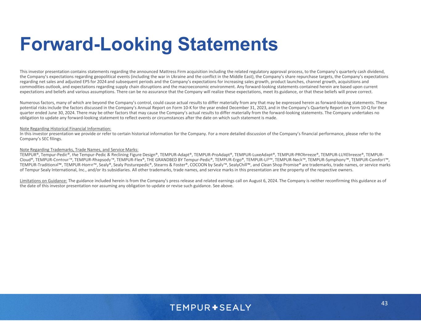 This investor presentation contains statements regarding the announced Mattress Firm acquisition including the related regulatory approval process, to the Company’s quarterly cash dividend,  the Company’s expectations regarding geopolitical events (including the war in Ukraine and the conflict in the Middle East), the Company’s share repurchase targets, the Company’s expectations  regarding net sales and adjusted EPS for 2024 and subsequent periods and the Company’s expectations for increasing sales growth, product launches, channel growth, acquisitions and  commodities outlook, and expectations regarding supply chain disruptions and the macroeconomic environment. Any forward‐looking statements contained herein are based upon current  expectations and beliefs and various assumptions. There can be no assurance that the Company will realize these expectations, meet its guidance, or that these beliefs will prove correct. Numerous factors, many of which are beyond the Company’s control, could cause actual results to differ materially from any that may be expressed herein as forward‐looking statements. These  potential risks include the factors discussed in the Company’s Annual Report on Form 10‐K for the year ended December 31, 2023, and in the Company’s Quarterly Report on Form 10‐Q for the  quarter ended June 30, 2024. There may be other factors that may cause the Company’s actual results to differ materially from the forward‐looking statements. The Company undertakes no  obligation to update any forward‐looking statement to reflect events or circumstances after the date on which such statement is made. Note Regarding Historical Financial Information:   In this investor presentation we provide or refer to certain historical information for the Company. For a more detailed discussion of the Company’s financial performance, please refer to the  Company’s SEC filings. Note Regarding Trademarks, Trade Names, and Service Marks:   TEMPUR®, Tempur‐Pedic®, the Tempur‐Pedic & Reclining Figure Design®, TEMPUR‐Adapt®, TEMPUR‐ProAdapt®, TEMPUR‐LuxeAdapt®, TEMPUR‐PRObreeze®, TEMPUR‐LUXEbreeze®, TEMPUR‐ Cloud®, TEMPUR‐Contour , TEMPUR‐Rhapsody , TEMPUR‐Flex®, THE GRANDBED BY Tempur‐Pedic®, TEMPUR‐Ergo®, TEMPUR‐UP , TEMPUR‐Neck , TEMPUR‐Symphony , TEMPUR‐Comfort ,  TEMPUR‐Traditional , TEMPUR‐Home , Sealy®, Sealy Posturepedic®, Stearns & Foster®, COCOON by Sealy , SealyChill , and Clean Shop Promise® are trademarks, trade names, or service marks  of Tempur Sealy International, Inc., and/or its subsidiaries. All other trademarks, trade names, and service marks in this presentation are the property of the respective owners. Limitations on Guidance: The guidance included herein is from the Company’s press release and related earnings call on August 6, 2024. The Company is neither reconfirming this guidance as of  the date of this investor presentation nor assuming any obligation to update or revise such guidance. See above. Forward-Looking Statements 43