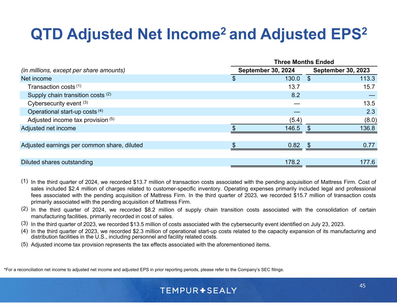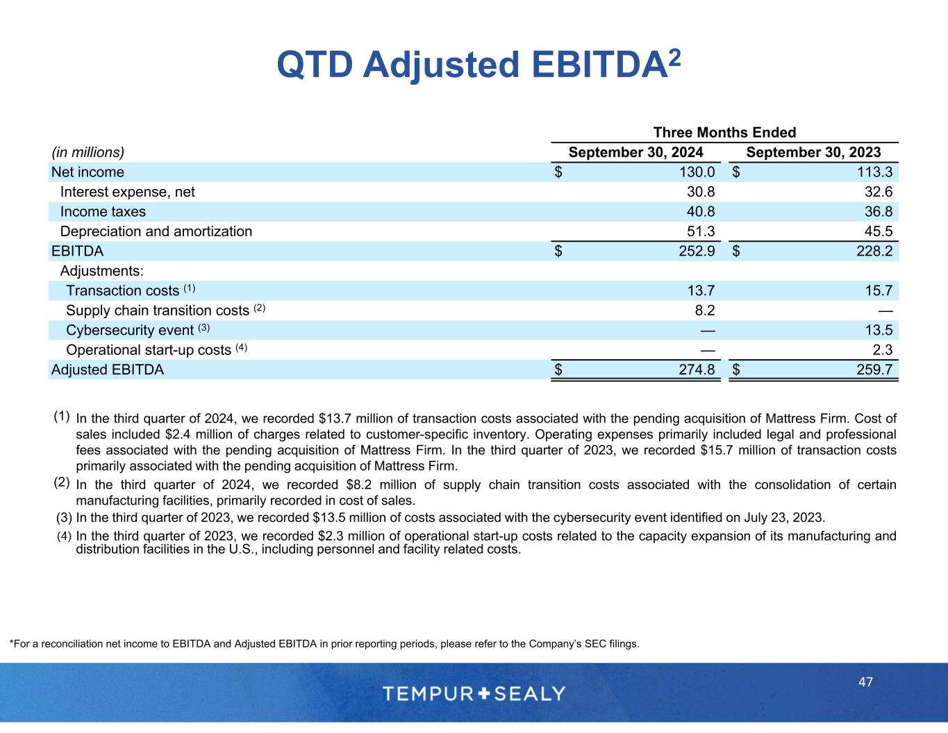 47 QTD Adjusted EBITDA2 *For a reconciliation net income to EBITDA and Adjusted EBITDA in prior reporting periods, please refer to the Company’s SEC filings. Three Months Ended September 30, 2023September 30, 2024(in millions) $ 113.3$ 130.0Net income 32.630.8Interest expense, net 36.840.8Income taxes 45.551.3Depreciation and amortization $ 228.2$ 252.9EBITDA Adjustments: 15.713.7Transaction costs (1) —8.2Supply chain transition costs (2) 13.5—Cybersecurity event (3) 2.3—Operational start-up costs (4) $ 259.7$ 274.8Adjusted EBITDA In the third quarter of 2024, we recorded $13.7 million of transaction costs associated with the pending acquisition of Mattress Firm. Cost of sales included $2.4 million of charges related to customer-specific inventory. Operating expenses primarily included legal and professional fees associated with the pending acquisition of Mattress Firm. In the third quarter of 2023, we recorded $15.7 million of transaction costs primarily associated with the pending acquisition of Mattress Firm. (1) In the third quarter of 2024, we recorded $8.2 million of supply chain transition costs associated with the consolidation of certain manufacturing facilities, primarily recorded in cost of sales. (2) In the third quarter of 2023, we recorded $13.5 million of costs associated with the cybersecurity event identified on July 23, 2023.(3) In the third quarter of 2023, we recorded $2.3 million of operational start-up costs related to the capacity expansion of its manufacturing and distribution facilities in the U.S., including personnel and facility related costs.(4)