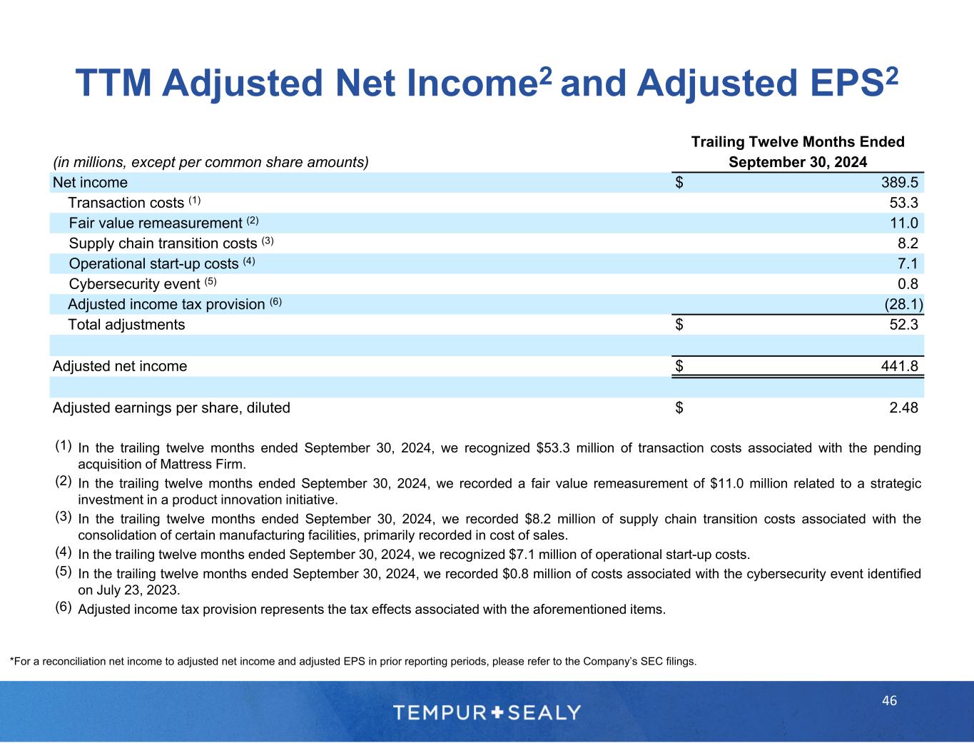 45 QTD Adjusted Net Income2 and Adjusted EPS2 *For a reconciliation net income to adjusted net income and adjusted EPS in prior reporting periods, please refer to the Company’s SEC filings. Three Months Ended September 30, 2023September 30, 2024(in millions, except per share amounts) $ 113.3$ 130.0Net income 15.713.7Transaction costs (1) —8.2Supply chain transition costs (2) 13.5—Cybersecurity event (3) 2.3—Operational start-up costs (4) (8.0)(5.4)Adjusted income tax provision (5) $ 136.8$ 146.5Adjusted net income $ 0.77$ 0.82Adjusted earnings per common share, diluted 177.6178.2Diluted shares outstanding In the third quarter of 2024, we recorded $13.7 million of transaction costs associated with the pending acquisition of Mattress Firm. Cost of sales included $2.4 million of charges related to customer-specific inventory. Operating expenses primarily included legal and professional fees associated with the pending acquisition of Mattress Firm. In the third quarter of 2023, we recorded $15.7 million of transaction costs primarily associated with the pending acquisition of Mattress Firm. (1) In the third quarter of 2024, we recorded $8.2 million of supply chain transition costs associated with the consolidation of certain manufacturing facilities, primarily recorded in cost of sales. (2) In the third quarter of 2023, we recorded $13.5 million of costs associated with the cybersecurity event identified on July 23, 2023.(3) In the third quarter of 2023, we recorded $2.3 million of operational start-up costs related to the capacity expansion of its manufacturing and distribution facilities in the U.S., including personnel and facility related costs. (4) Adjusted income tax provision represents the tax effects associated with the aforementioned items.(5)