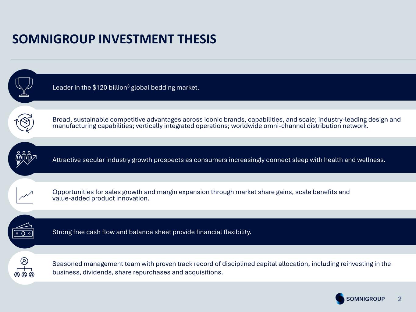 Leader in the $120 billion3 global bedding market. Broad, sustainable competitive advantages across iconic brands, capabilities, and scale; industry-leading design and manufacturing capabilities; vertically integrated operations; worldwide omni-channel distribution network. Attractive secular industry growth prospects as consumers increasingly connect sleep with health and wellness. Opportunities for sales growth and margin expansion through market share gains, scale benefits and value-added product innovation. Strong free cash flow and balance sheet provide financial flexibility. Seasoned management team with proven track record of disciplined capital allocation, including reinvesting in the business, dividends, share repurchases and acquisitions. SOMNIGROUP INVESTMENT THESIS 2