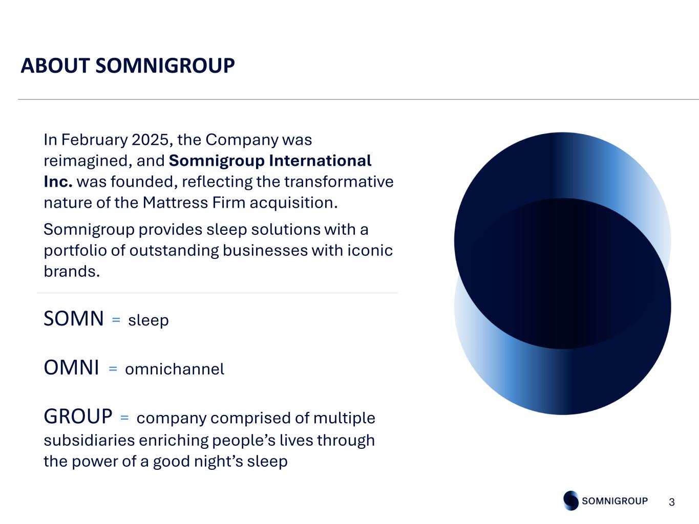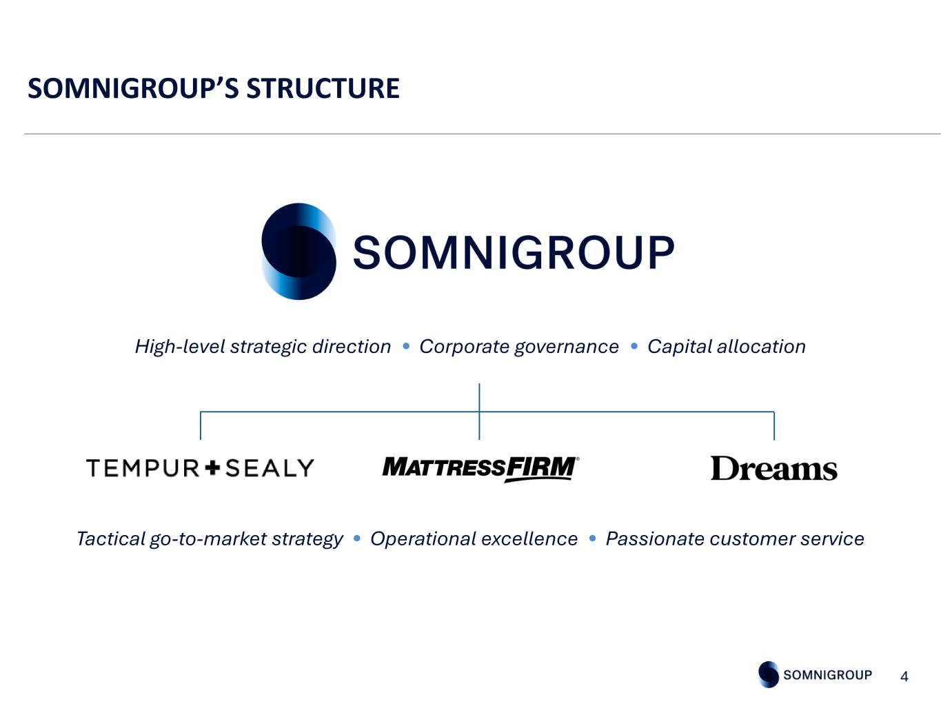 In February 2025, the Company was reimagined, and Somnigroup International Inc. was founded, reflecting the transformative nature of the Mattress Firm acquisition. Somnigroup provides sleep solutions with a portfolio of outstanding businesses with iconic brands. SOMN = sleep OMNI = omnichannel GROUP = company comprised of multiple subsidiaries enriching people’s lives through the power of a good night’s sleep 3 ABOUT SOMNIGROUP