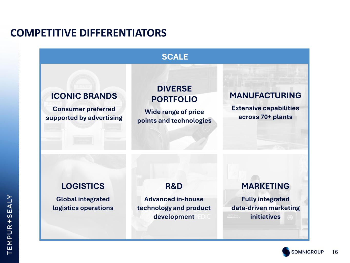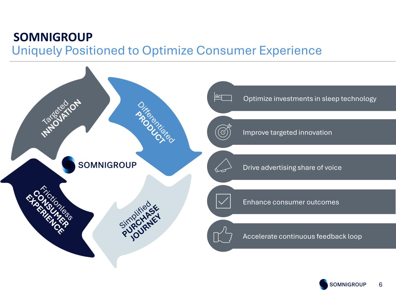 SOMNIGROUP 5 CONSUMER-CENTRIC INNOVATION DIVERSIFIED PORTFOLIO MANUFACTURING & LOGISTICS OMNI-CHANNEL RETAIL • Advanced R&D capabilities driving continuous solutions-based innovation • Diverse brand portfolio includes the most highly recognized brands in the industry • Global manufacturing footprint with advanced manufacturing and logistics capabilities • Leading bedding retailer in the U.S. and UK • Integrated brick- and-mortar and e-commerce ecosystem The world’s largest bedding company, dedicated to enriching people’s lives through the power of a good night’s sleep.