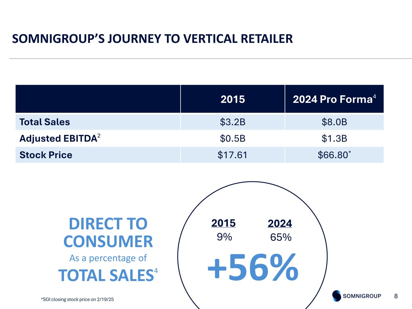 SOMNIGROUP’S JOURNEY TO VERTICAL RETAILER 8 2015 2024 Pro Forma4 Total Sales $3.2B $8.0B Adjusted EBITDA2 $0.5B $1.3B Stock Price $17.61 $66.80* +56% DIRECT TO CONSUMER As a percentage of TOTAL SALES4 2015 9% 2024 65% *SGI closing stock price on 2/19/25