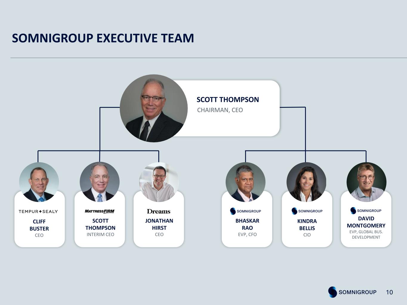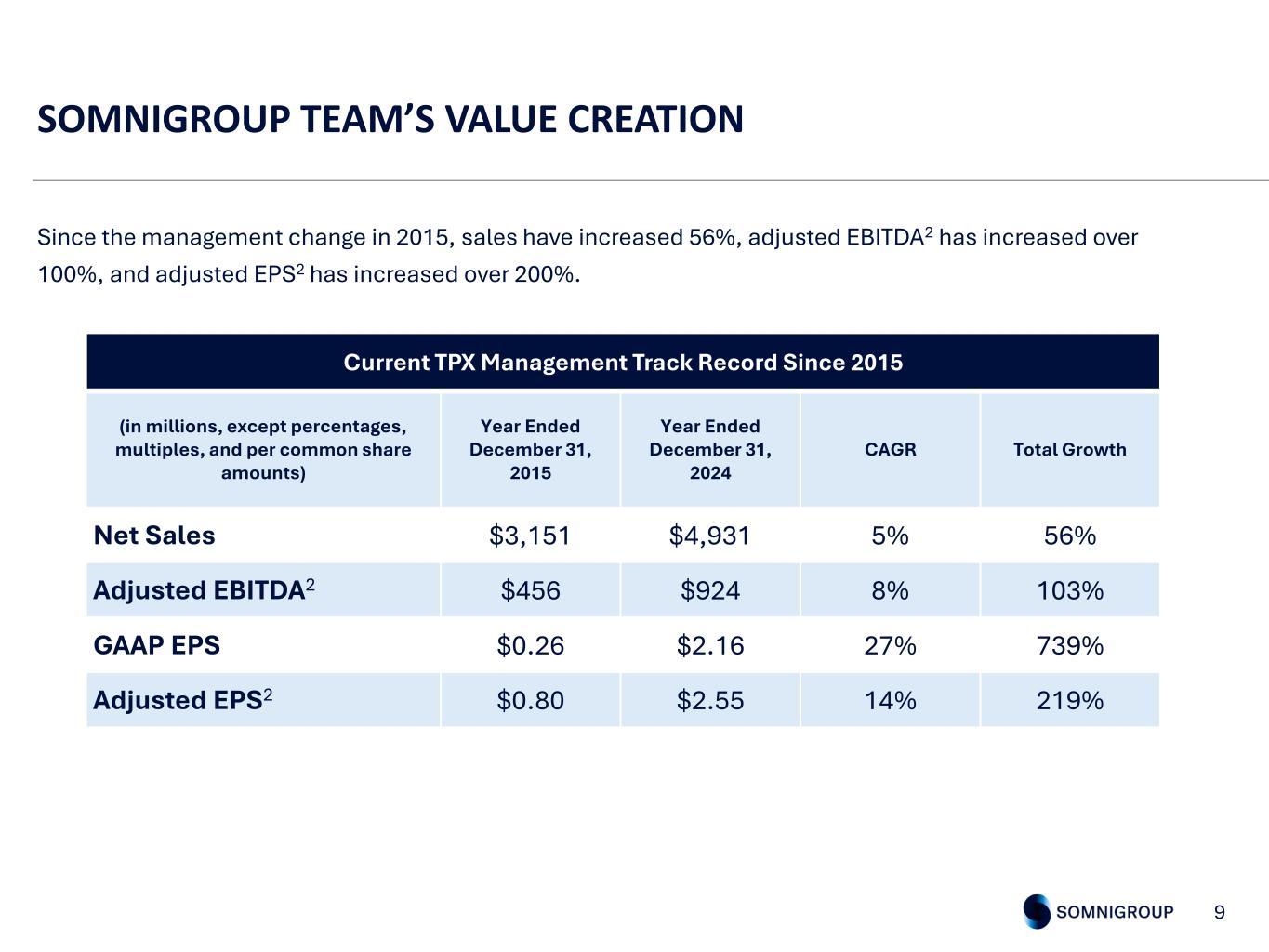SOMNIGROUP TEAM’S VALUE CREATION 9 Since the management change in 2015, sales have increased 56%, adjusted EBITDA2 has increased over 100%, and adjusted EPS2 has increased over 200%. Current TPX Management Track Record Since 2015 (in millions, except percentages, multiples, and per common share amounts) Year Ended December 31, 2015 Year Ended December 31, 2024 CAGR Total Growth Net Sales $3,151 $4,931 5% 56% Adjusted EBITDA2 $456 $924 8% 103% GAAP EPS $0.26 $2.16 27% 739% Adjusted EPS2 $0.80 $2.55 14% 219%