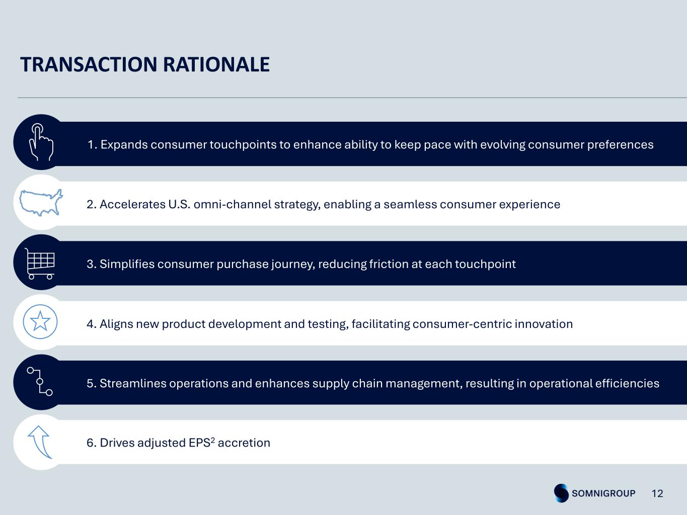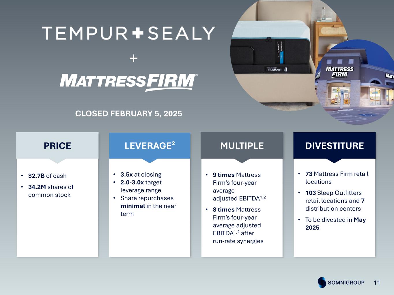 + 11 LEVERAGE2 • 3.5x at closing • 2.0-3.0x target leverage range • Share repurchases minimal in the near term PRICE • $2.7B of cash • 34.2M shares of common stock MULTIPLE • 9 times Mattress Firm’s four-year average adjusted EBITDA1,2 • 8 times Mattress Firm’s four-year average adjusted EBITDA1,2 after run-rate synergies DIVESTITURE • 73 Mattress Firm retail locations • 103 Sleep Outfitters retail locations and 7 distribution centers • To be divested in May 2025 CLOSED FEBRUARY 5, 2025
