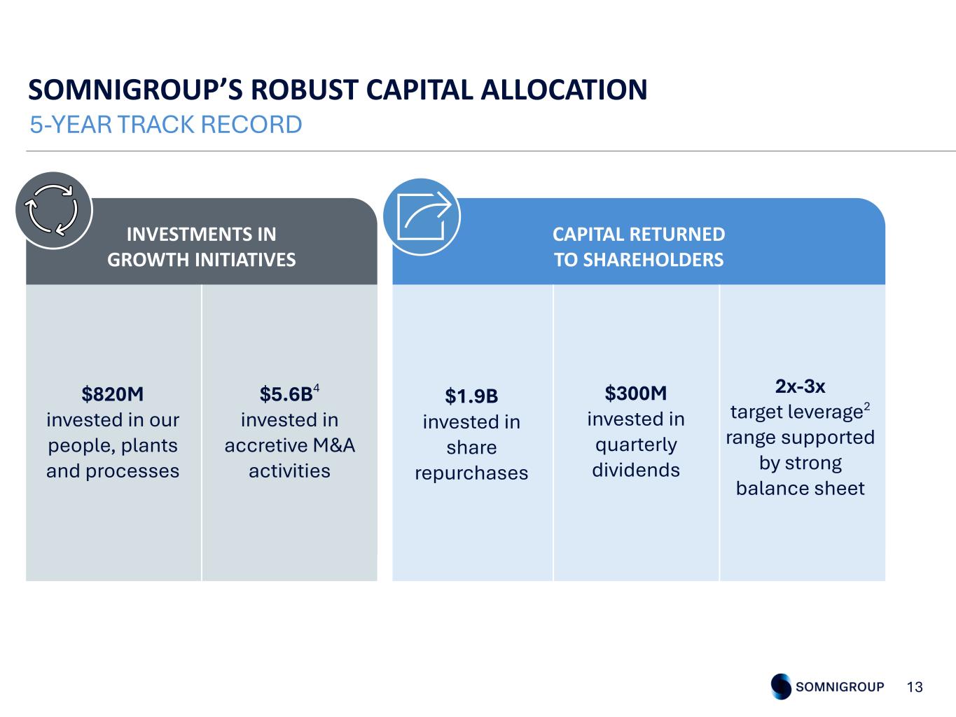 SOMNIGROUP’S ROBUST CAPITAL ALLOCATION 13 INVESTMENTS IN GROWTH INITIATIVES CAPITAL RETURNED TO SHAREHOLDERS $820M invested in our people, plants and processes $5.6B4 invested in accretive M&A activities $1.9B invested in share repurchases $300M invested in quarterly dividends 2x-3x target leverage2 range supported by strong balance sheet 5-YEAR TRACK RECORD