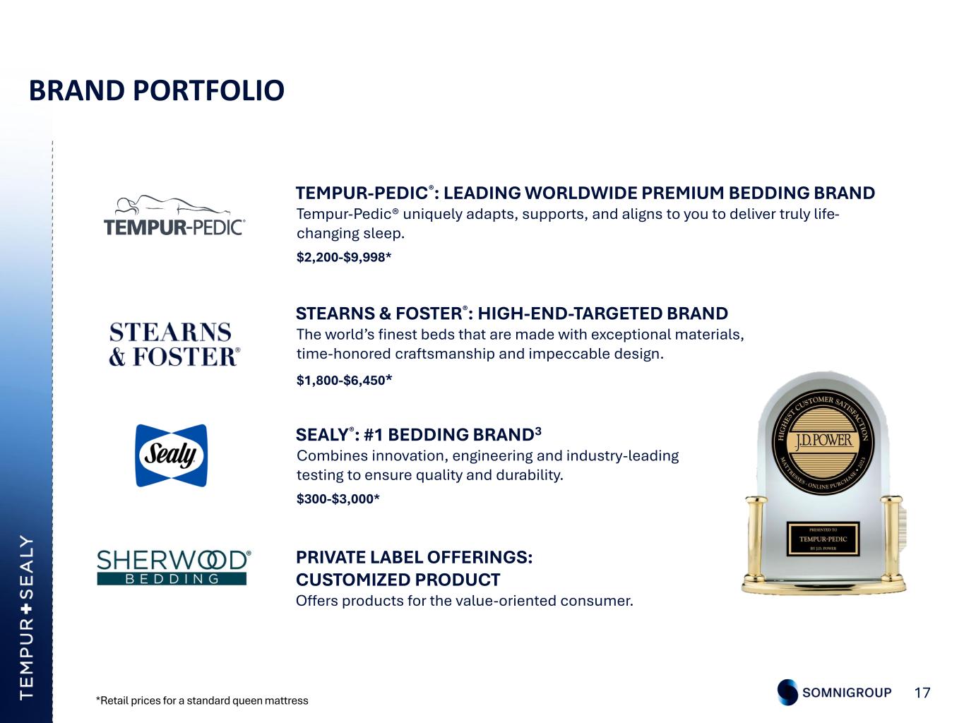 BRAND PORTFOLIO 17 TEMPUR-PEDIC®: LEADING WORLDWIDE PREMIUM BEDDING BRAND Tempur-Pedic® uniquely adapts, supports, and aligns to you to deliver truly life- changing sleep. $2,200-$9,998* STEARNS & FOSTER®: HIGH-END-TARGETED BRAND The world’s finest beds that are made with exceptional materials, time-honored craftsmanship and impeccable design. $1,800-$6,450* SEALY®: #1 BEDDING BRAND3 Combines innovation, engineering and industry-leading testing to ensure quality and durability. $300-$3,000* PRIVATE LABEL OFFERINGS: CUSTOMIZED PRODUCT Offers products for the value-oriented consumer. *Retail prices for a standard queen mattress