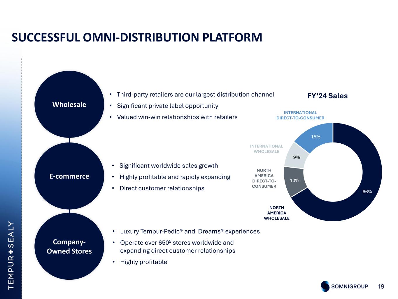 GLOBAL MANUFACTURING FOOTPRINT 18 71 manufacturing facilities 20 million sq. ft. of manufacturing and distribution operations 4 state-of-the-art product testing locations 75k sq. ft. R&D innovation Wholly owned (31) Joint Venture (9) Licensee (27)Tempur-Pedic® Facility (4)
