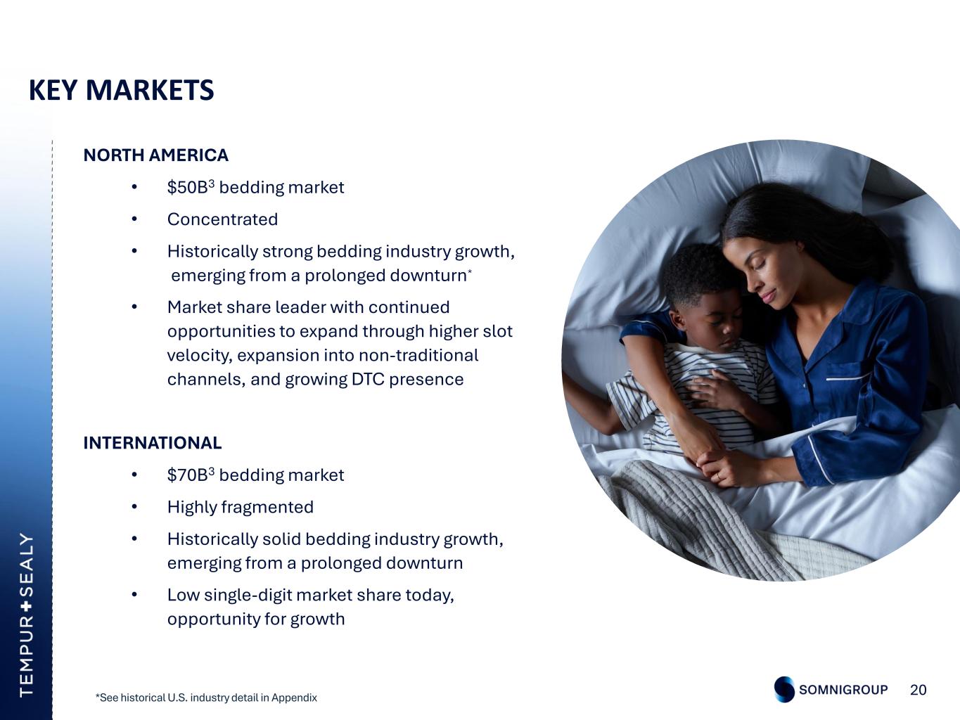 KEY MARKETS 20 NORTH AMERICA • $50B3 bedding market • Concentrated • Historically strong bedding industry growth, emerging from a prolonged downturn* • Market share leader with continued opportunities to expand through higher slot velocity, expansion into non-traditional channels, and growing DTC presence INTERNATIONAL • $70B3 bedding market • Highly fragmented • Historically solid bedding industry growth, emerging from a prolonged downturn • Low single-digit market share today, opportunity for growth *See historical U.S. industry detail in Appendix