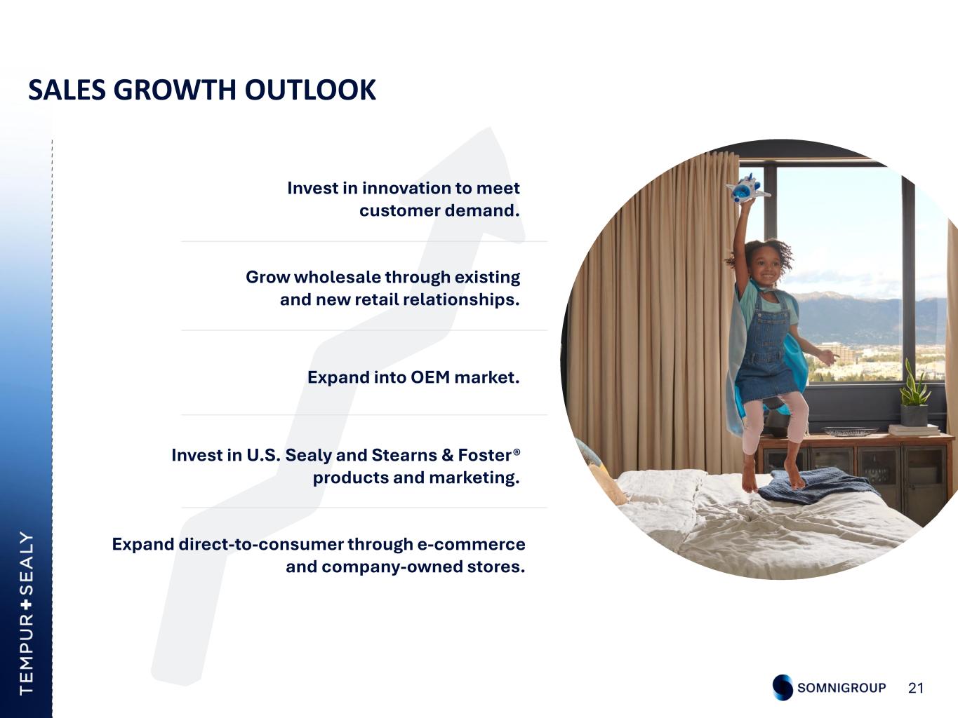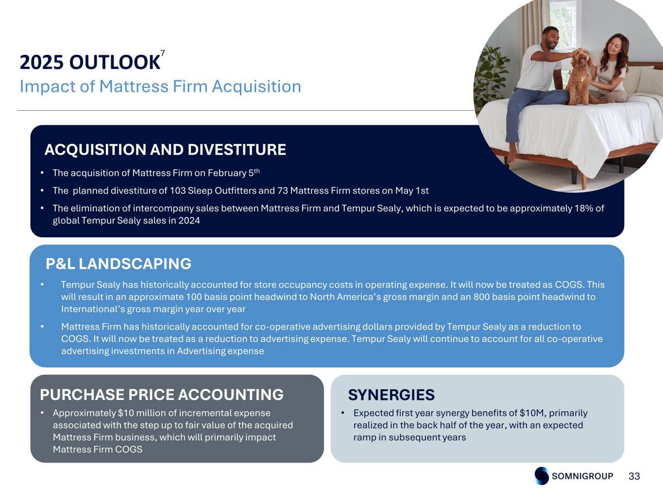 33 Impact of Mattress Firm Acquisition ACQUISITION AND DIVESTITURE • The acquisition of Mattress Firm on February 5th • The planned divestiture of 103 Sleep Outfitters and 73 Mattress Firm stores on May 1st • The elimination of intercompany sales between Mattress Firm and Tempur Sealy, which is expected to be approximately 18% of global Tempur Sealy sales in 2024 • Tempur Sealy has historically accounted for store occupancy costs in operating expense. It will now be treated as COGS. This will result in an approximate 100 basis point headwind to North America’s gross margin and an 800 basis point headwind to International’s gross margin year over year • Mattress Firm has historically accounted for co-operative advertising dollars provided by Tempur Sealy as a reduction to COGS. It will now be treated as a reduction to advertising expense. Tempur Sealy will continue to account for all co-operative advertising investments in Advertising expense P&L LANDSCAPING PURCHASE PRICE ACCOUNTING • Approximately $10 million of incremental expense associated with the step up to fair value of the acquired Mattress Firm business, which will primarily impact Mattress Firm COGS SYNERGIES • Expected first year synergy benefits of $10M, primarily realized in the back half of the year, with an expected ramp in subsequent years 2025 OUTLOOK 7