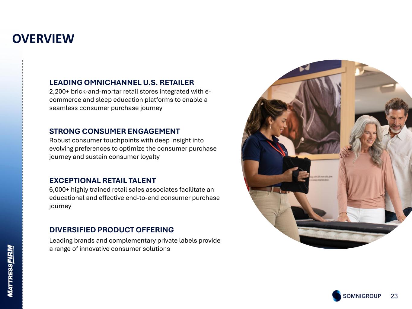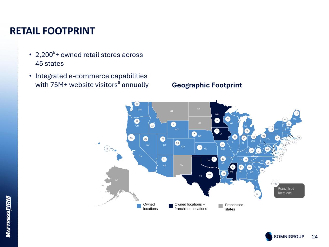 OVERVIEW 23 LEADING OMNICHANNEL U.S. RETAILER 2,200+ brick-and-mortar retail stores integrated with e- commerce and sleep education platforms to enable a seamless consumer purchase journey STRONG CONSUMER ENGAGEMENT Robust consumer touchpoints with deep insight into evolving preferences to optimize the consumer purchase journey and sustain consumer loyalty EXCEPTIONAL RETAIL TALENT 6,000+ highly trained retail sales associates facilitate an educational and effective end-to-end consumer purchase journey DIVERSIFIED PRODUCT OFFERING Leading brands and complementary private labels provide a range of innovative consumer solutions