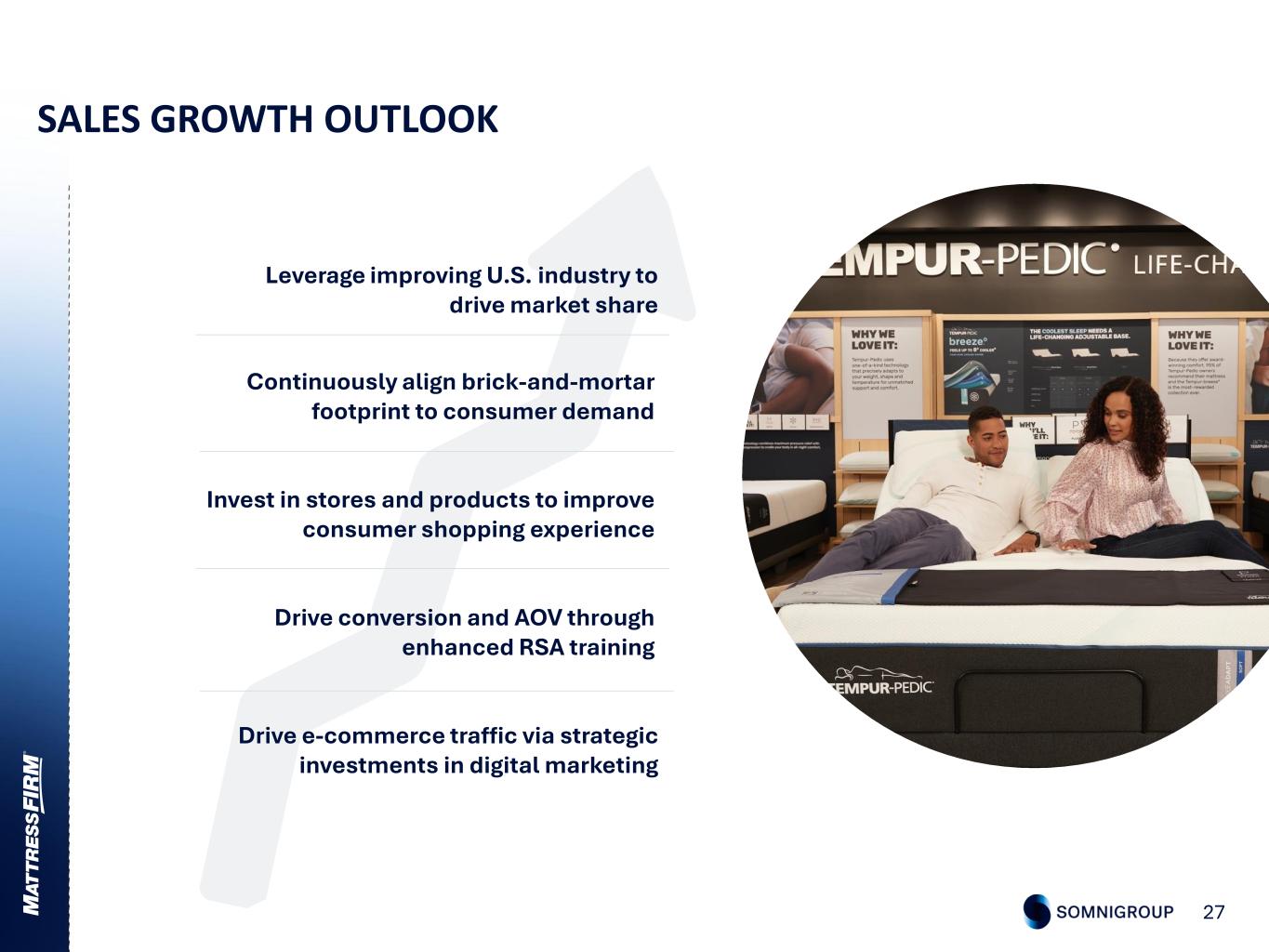 SCALE COMPETITIVE DIFFERENTIATORS 26 PRODUCT SELECTION Diverse and curated assortment CONVENIENCE Seamless experience nationwide on and offline RETAIL EXPERTISE Highly trained Sleep Experts EXPERIENCE Personalized to each consumer CONSUMER TOUCHPOINTS Data driven tools improving consumer outcomes LOGISTICS Accelerated order-to-deliver