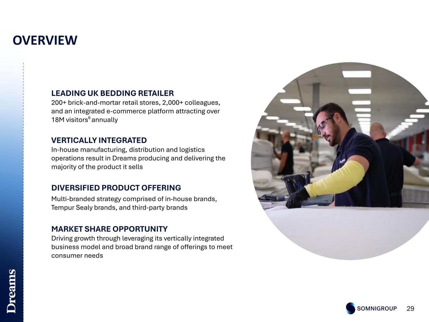 DIVERSIFIED PRODUCT OFFERING Multi-branded strategy comprised of in-house brands, Tempur Sealy brands, and third-party brands OVERVIEW 29 LEADING UK BEDDING RETAILER 200+ brick-and-mortar retail stores, 2,000+ colleagues, and an integrated e-commerce platform attracting over 18M visitors6 annually VERTICALLY INTEGRATED In-house manufacturing, distribution and logistics operations result in Dreams producing and delivering the majority of the product it sells MARKET SHARE OPPORTUNITY Driving growth through leveraging its vertically integrated business model and broad brand range of offerings to meet consumer needs