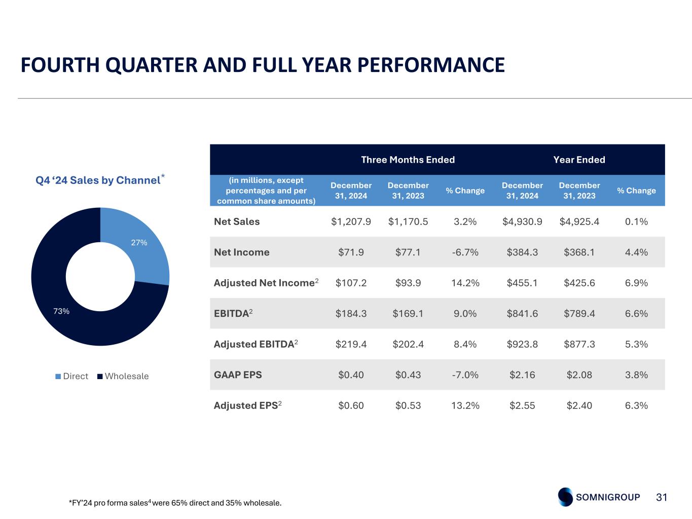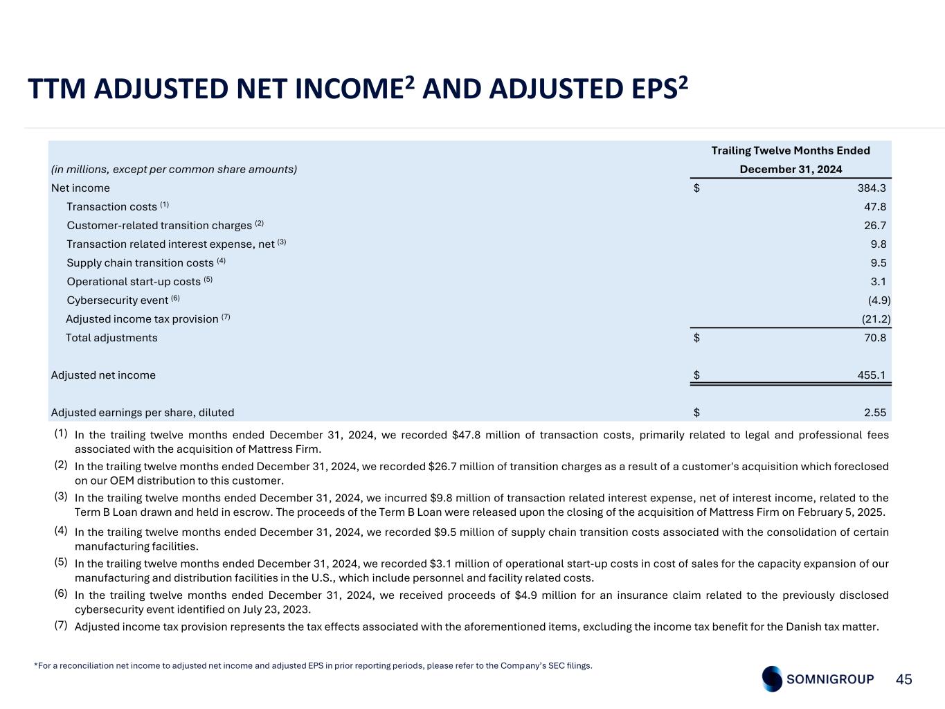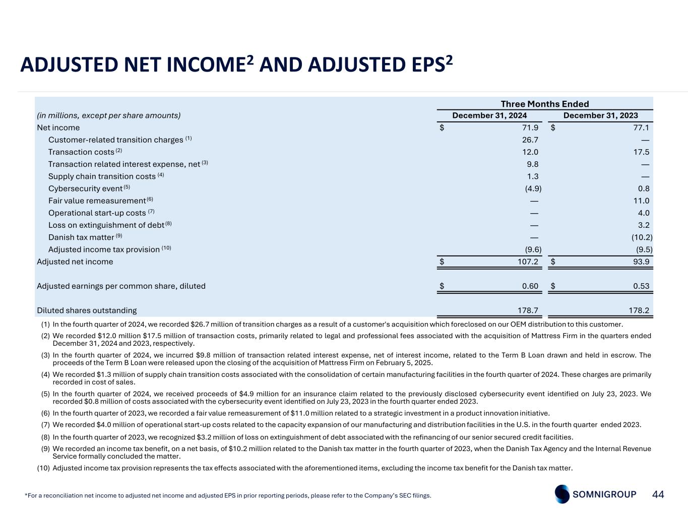 (1) In the fourth quarter of 2024, we recorded $26.7 million of transition charges as a result of a customer's acquisition which foreclosed on our OEM distribution to this customer. (2) We recorded $12.0 million $17.5 million of transaction costs, primarily related to legal and professional fees associated with the acquisition of Mattress Firm in the quarters ended December 31, 2024 and 2023, respectively. (3) In the fourth quarter of 2024, we incurred $9.8 million of transaction related interest expense, net of interest income, related to the Term B Loan drawn and held in escrow. The proceeds of the Term B Loan were released upon the closing of the acquisition of Mattress Firm on February 5, 2025. (4) We recorded $1.3 million of supply chain transition costs associated with the consolidation of certain manufacturing facilities in the fourth quarter of 2024. These charges are primarily recorded in cost of sales. (5) In the fourth quarter of 2024, we received proceeds of $4.9 million for an insurance claim related to the previously disclosed cybersecurity event identified on July 23, 2023. We recorded $0.8 million of costs associated with the cybersecurity event identified on July 23, 2023 in the fourth quarter ended 2023. (6) In the fourth quarter of 2023, we recorded a fair value remeasurement of $11.0 million related to a strategic investment in a product innovation initiative. (7) We recorded $4.0 million of operational start-up costs related to the capacity expansion of our manufacturing and distribution facilities in the U.S. in the fourth quarter ended 2023. (8) In the fourth quarter of 2023, we recognized $3.2 million of loss on extinguishment of debt associated with the refinancing of our senior secured credit facilities. (9) We recorded an income tax benefit, on a net basis, of $10.2 million related to the Danish tax matter in the fourth quarter of 2023, when the Danish Tax Agency and the Internal Revenue Service formally concluded the matter. (10) Adjusted income tax provision represents the tax effects associated with the aforementioned items, excluding the income tax benefit for the Danish tax matter. 44 ADJUSTED NET INCOME2 AND ADJUSTED EPS2 *For a reconciliation net income to adjusted net income and adjusted EPS in prior reporting periods, please refer to the Company’s SEC filings. Three Months Ended (in millions, except per share amounts) December 31, 2024 December 31, 2023 Net income $ 71.9 $ 77.1 Customer-related transition charges (1) 26.7 — Transaction costs (2) 12.0 17.5 Transaction related interest expense, net (3) 9.8 — Supply chain transition costs (4) 1.3 — Cybersecurity event (5) (4.9) 0.8 Fair value remeasurement (6) — 11.0 Operational start-up costs (7) — 4.0 Loss on extinguishment of debt (8) — 3.2 Danish tax matter (9) — (10.2) Adjusted income tax provision (10) (9.6) (9.5) Adjusted net income $ 107.2 $ 93.9 Adjusted earnings per common share, diluted $ 0.60 $ 0.53 Diluted shares outstanding 178.7 178.2