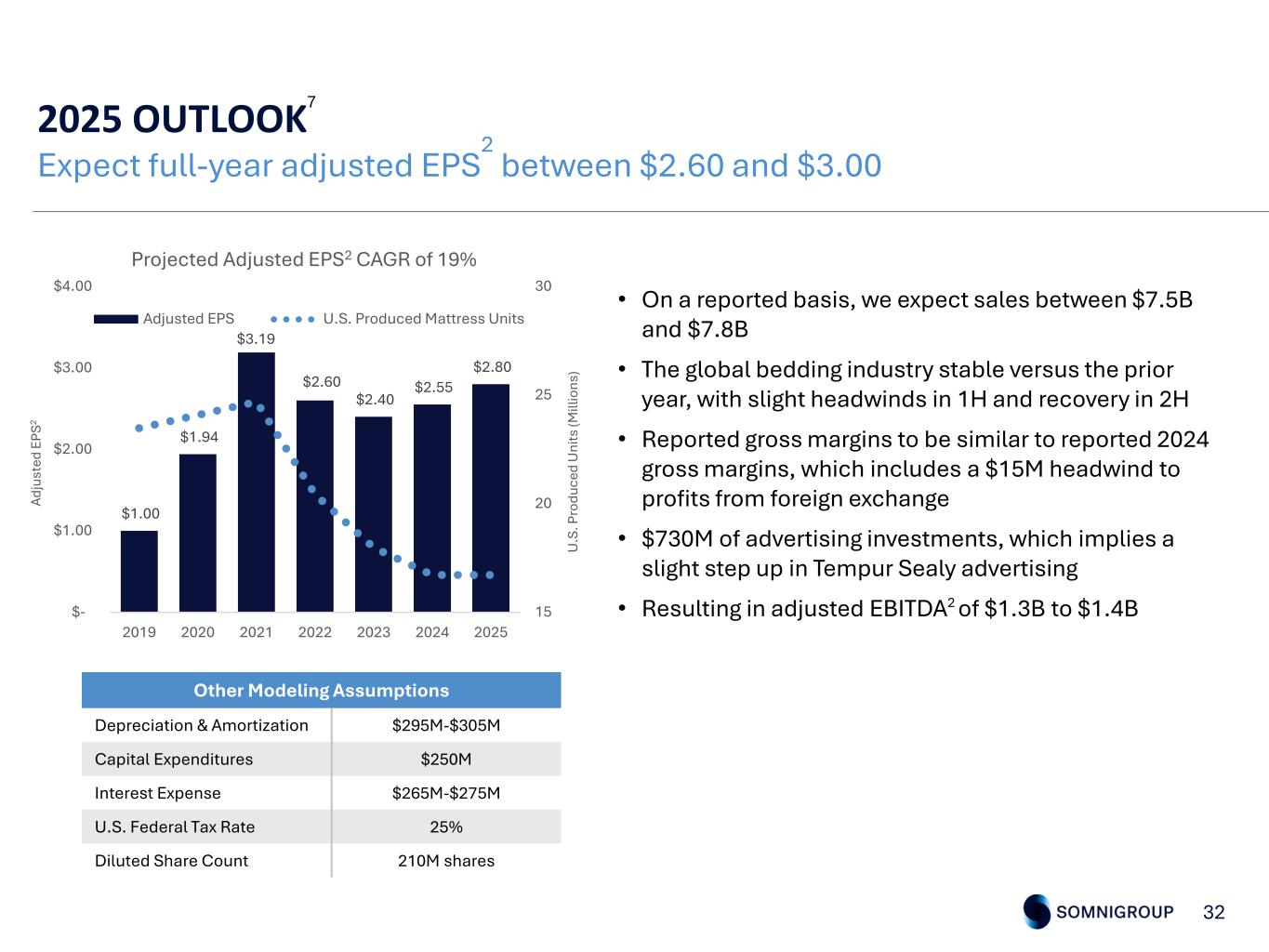 2025 OUTLOOK 7 32 Expect full-year adjusted EPS 2 between $2.60 and $3.00 Other Modeling Assumptions Depreciation & Amortization $295M-$305M Capital Expenditures $250M Interest Expense $265M-$275M U.S. Federal Tax Rate 25% Diluted Share Count 210M shares • On a reported basis, we expect sales between $7.5B and $7.8B • The global bedding industry stable versus the prior year, with slight headwinds in 1H and recovery in 2H • Reported gross margins to be similar to reported 2024 gross margins, which includes a $15M headwind to profits from foreign exchange • $730M of advertising investments, which implies a slight step up in Tempur Sealy advertising • Resulting in adjusted EBITDA2 of $1.3B to $1.4B $1.00 $1.94 $3.19 $2.60 $2.40 $2.55 $2.80 15 20 25 30 $- $1.00 $2.00 $3.00 $4.00 2019 2020 2021 2022 2023 2024 2025 U .S . P ro du ce d U ni ts (M ill io ns ) Ad ju st ed E PS 2 Projected Adjusted EPS2 CAGR of 19% Adjusted EPS U.S. Produced Mattress Units