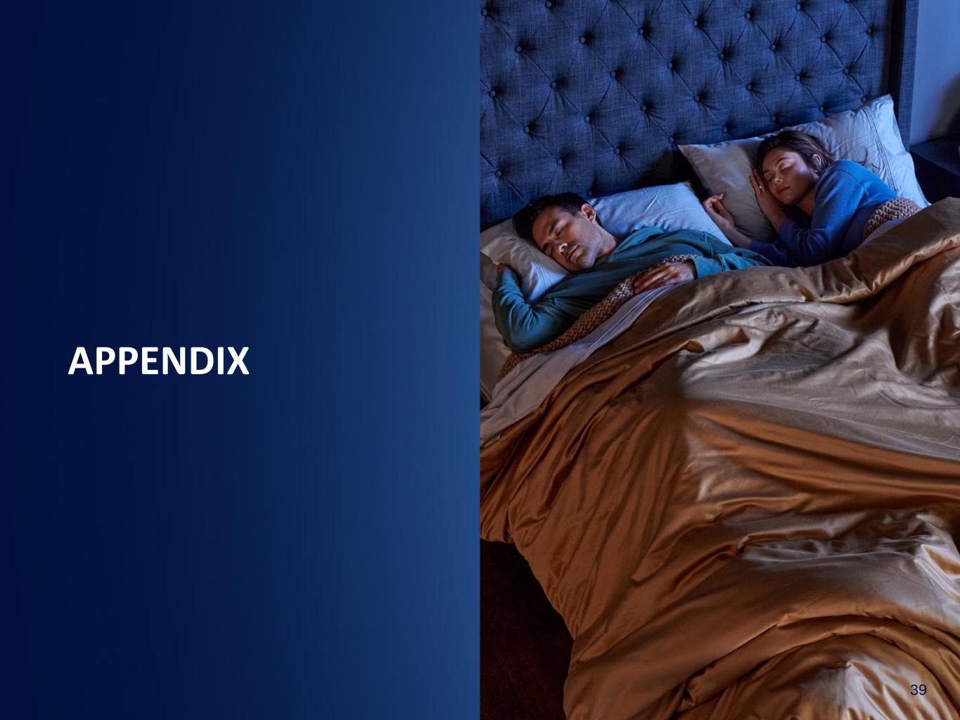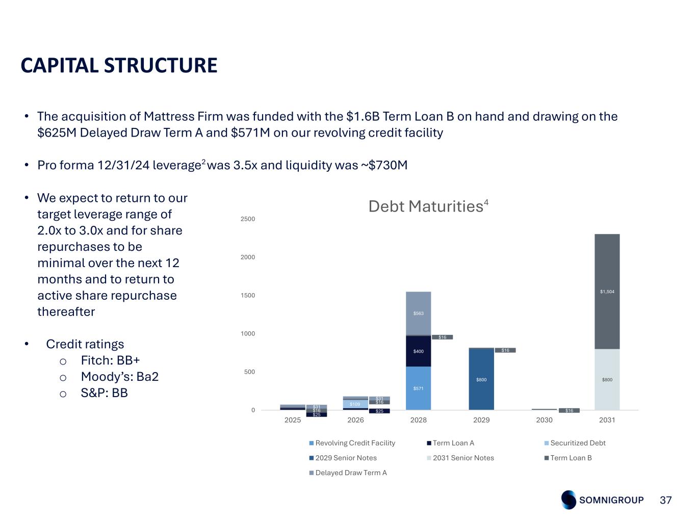 CAPITAL STRUCTURE 37 • The acquisition of Mattress Firm was funded with the $1.6B Term Loan B on hand and drawing on the $625M Delayed Draw Term A and $571M on our revolving credit facility • Pro forma 12/31/24 leverage2 was 3.5x and liquidity was ~$730M $571 $25 $25 $400 $109 $800 $800 $16 $16 $16 $16 $16 $1,504 $31 $31 $563 0 500 1000 1500 2000 2500 2025 2026 2028 2029 2030 2031 Debt Maturities4 Revolving Credit Facility Term Loan A Securitized Debt 2029 Senior Notes 2031 Senior Notes Term Loan B Delayed Draw Term A • We expect to return to our target leverage range of 2.0x to 3.0x and for share repurchases to be minimal over the next 12 months and to return to active share repurchase thereafter • Credit ratings o Fitch: BB+ o Moody’s: Ba2 o S&P: BB
