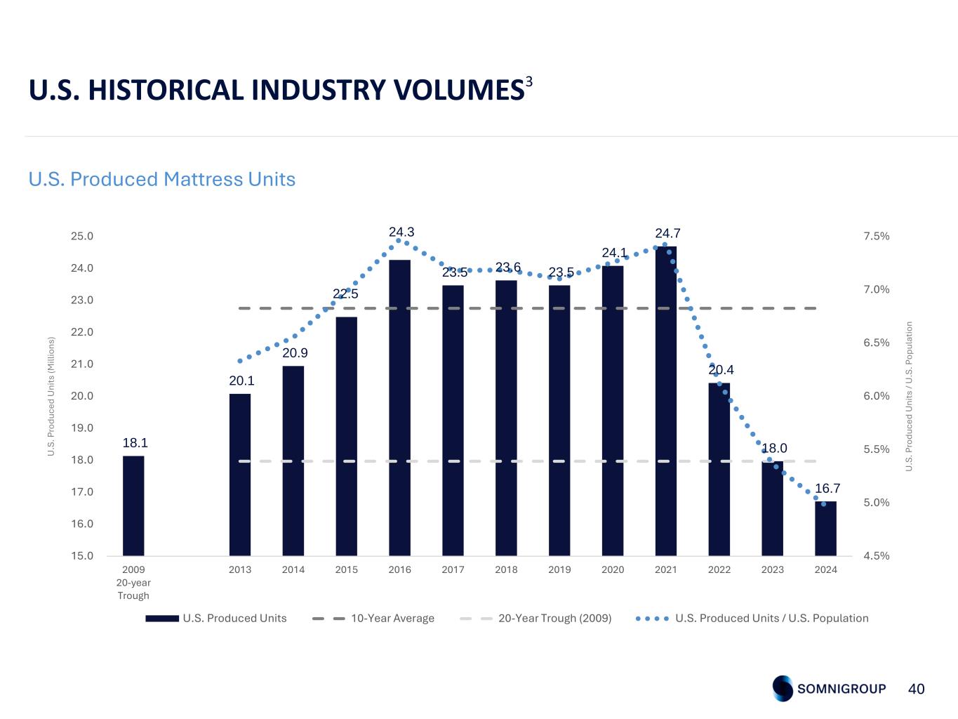 U.S. HISTORICAL INDUSTRY VOLUMES3 40 U.S. Produced Mattress Units Source: ISPA, U.S. ITC, management estimates 18.1 20.1 20.9 22.5 24.3 23.5 23.6 23.5 24.1 24.7 20.4 18.0 16.7 4.5% 5.0% 5.5% 6.0% 6.5% 7.0% 7.5% 15.0 16.0 17.0 18.0 19.0 20.0 21.0 22.0 23.0 24.0 25.0 2009 20-year Trough 2013 2014 2015 2016 2017 2018 2019 2020 2021 2022 2023 2024 U .S . P ro du ce d U ni ts / U .S . P op ul at io n U .S . P ro du ce d U ni ts (M ill io ns ) U.S. Produced Units 10-Year Average 20-Year Trough (2009) U.S. Produced Units / U.S. Population
