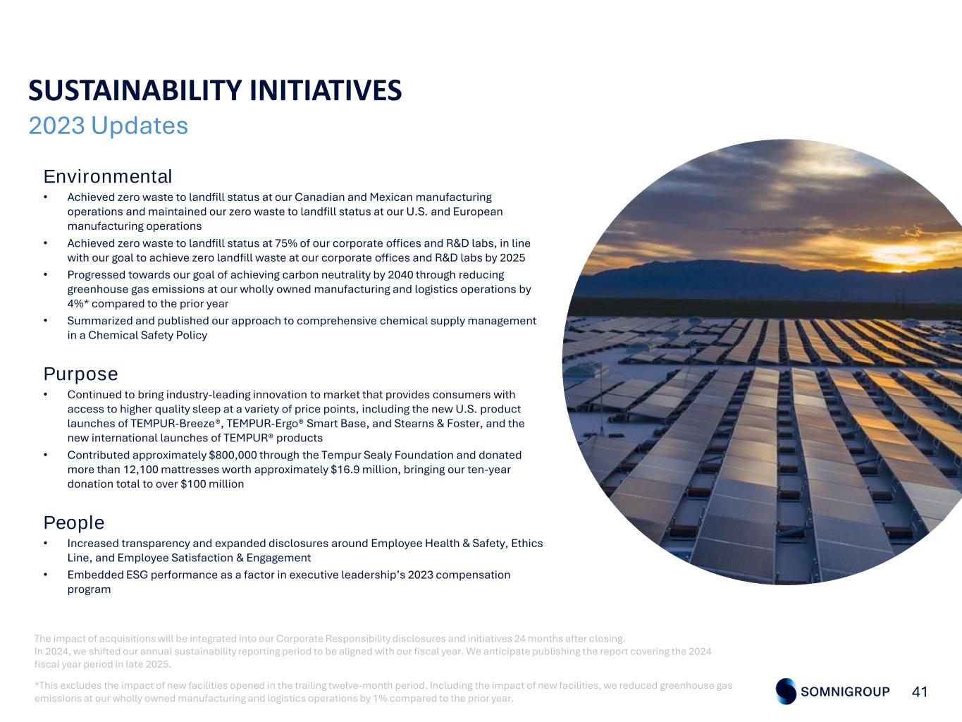 41 SUSTAINABILITY INITIATIVES Environmental • Achieved zero waste to landfill status at our Canadian and Mexican manufacturing operations and maintained our zero waste to landfill status at our U.S. and European manufacturing operations • Achieved zero waste to landfill status at 75% of our corporate offices and R&D labs, in line with our goal to achieve zero landfill waste at our corporate offices and R&D labs by 2025 • Progressed towards our goal of achieving carbon neutrality by 2040 through reducing greenhouse gas emissions at our wholly owned manufacturing and logistics operations by 4%* compared to the prior year • Summarized and published our approach to comprehensive chemical supply management in a Chemical Safety Policy Purpose • Continued to bring industry-leading innovation to market that provides consumers with access to higher quality sleep at a variety of price points, including the new U.S. product launches of TEMPUR-Breeze®, TEMPUR-Ergo® Smart Base, and Stearns & Foster, and the new international launches of TEMPUR® products • Contributed approximately $800,000 through the Tempur Sealy Foundation and donated more than 12,100 mattresses worth approximately $16.9 million, bringing our ten-year donation total to over $100 million People • Increased transparency and expanded disclosures around Employee Health & Safety, Ethics Line, and Employee Satisfaction & Engagement • Embedded ESG performance as a factor in executive leadership’s 2023 compensation program *This excludes the impact of new facilities opened in the trailing twelve-month period. Including the impact of new facilities, we reduced greenhouse gas emissions at our wholly owned manufacturing and logistics operations by 1% compared to the prior year. The impact of acquisitions will be integrated into our Corporate Responsibility disclosures and initiatives 24 months after closing. In 2024, we shifted our annual sustainability reporting period to be aligned with our fiscal year. We anticipate publishing the report covering the 2024 fiscal year period in late 2025. 2023 Updates