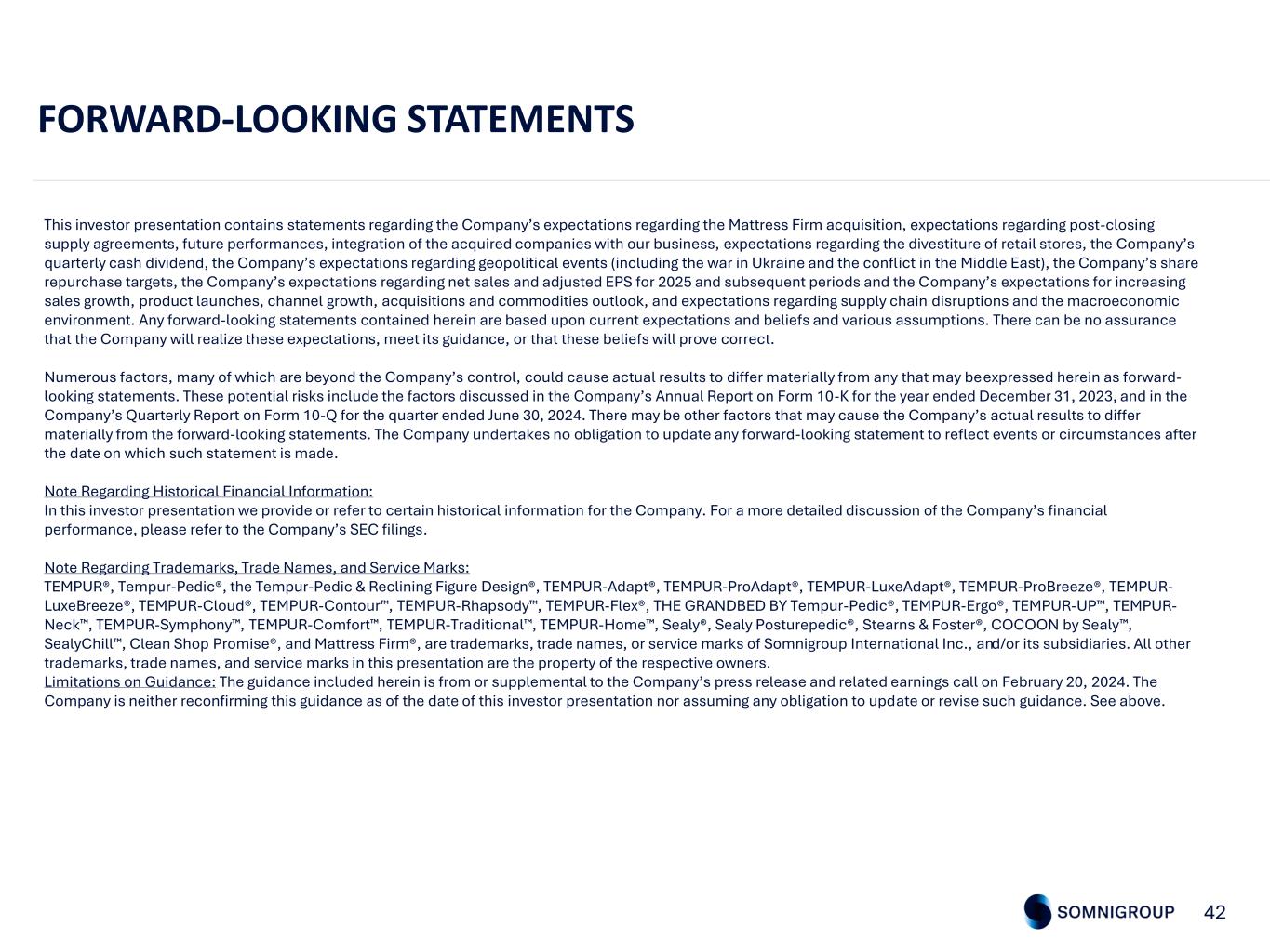 42 This investor presentation contains statements regarding the Company’s expectations regarding the Mattress Firm acquisition, expectations regarding post-closing supply agreements, future performances, integration of the acquired companies with our business, expectations regarding the divestiture of retail stores, the Company’s quarterly cash dividend, the Company’s expectations regarding geopolitical events (including the war in Ukraine and the conflict in the Middle East), the Company’s share repurchase targets, the Company’s expectations regarding net sales and adjusted EPS for 2025 and subsequent periods and the Company’s expectations for increasing sales growth, product launches, channel growth, acquisitions and commodities outlook, and expectations regarding supply chain disruptions and the macroeconomic environment. Any forward-looking statements contained herein are based upon current expectations and beliefs and various assumptions. There can be no assurance that the Company will realize these expectations, meet its guidance, or that these beliefs will prove correct. Numerous factors, many of which are beyond the Company’s control, could cause actual results to differ materially from any that may beexpressed herein as forward- looking statements. These potential risks include the factors discussed in the Company’s Annual Report on Form 10-K for the year ended December 31, 2023, and in the Company’s Quarterly Report on Form 10-Q for the quarter ended June 30, 2024. There may be other factors that may cause the Company’s actual results to differ materially from the forward-looking statements. The Company undertakes no obligation to update any forward-looking statement to reflect events or circumstances after the date on which such statement is made. Note Regarding Historical Financial Information: In this investor presentation we provide or refer to certain historical information for the Company. For a more detailed discussion of the Company’s financial performance, please refer to the Company’s SEC filings. Note Regarding Trademarks, Trade Names, and Service Marks: TEMPUR®, Tempur-Pedic®, the Tempur-Pedic & Reclining Figure Design®, TEMPUR-Adapt®, TEMPUR-ProAdapt®, TEMPUR-LuxeAdapt®, TEMPUR-ProBreeze®, TEMPUR- LuxeBreeze®, TEMPUR-Cloud®, TEMPUR-Contour™, TEMPUR-Rhapsody™, TEMPUR-Flex®, THE GRANDBED BY Tempur-Pedic®, TEMPUR-Ergo®, TEMPUR-UP™, TEMPUR- Neck™, TEMPUR-Symphony™, TEMPUR-Comfort™, TEMPUR-Traditional™, TEMPUR-Home™, Sealy®, Sealy Posturepedic®, Stearns & Foster®, COCOON by Sealy™, SealyChill™, Clean Shop Promise®, and Mattress Firm®, are trademarks, trade names, or service marks of Somnigroup International Inc., and/or its subsidiaries. All other trademarks, trade names, and service marks in this presentation are the property of the respective owners. Limitations on Guidance: The guidance included herein is from or supplemental to the Company’s press release and related earnings call on February 20, 2024. The Company is neither reconfirming this guidance as of the date of this investor presentation nor assuming any obligation to update or revise such guidance. See above. FORWARD-LOOKING STATEMENTS