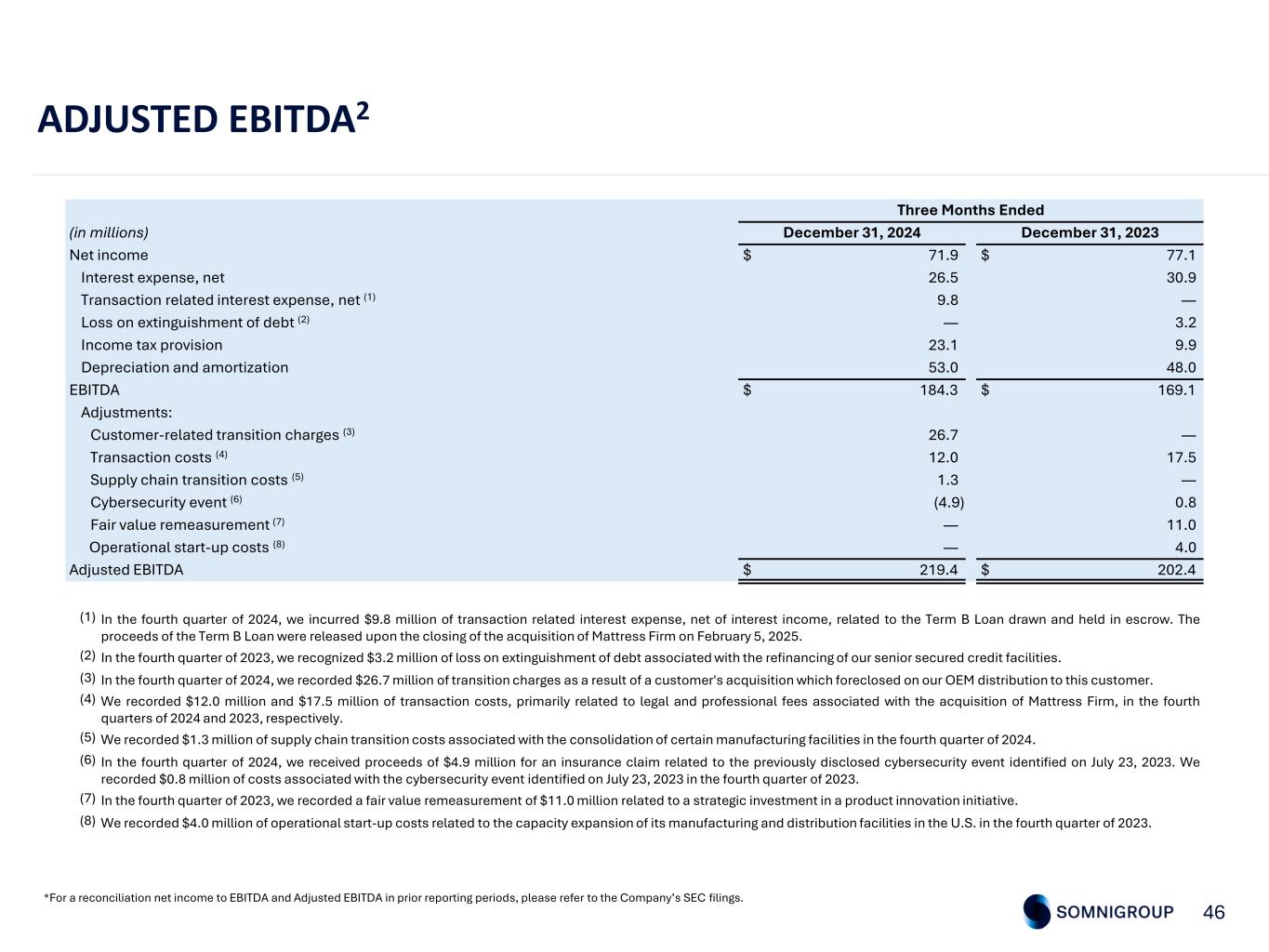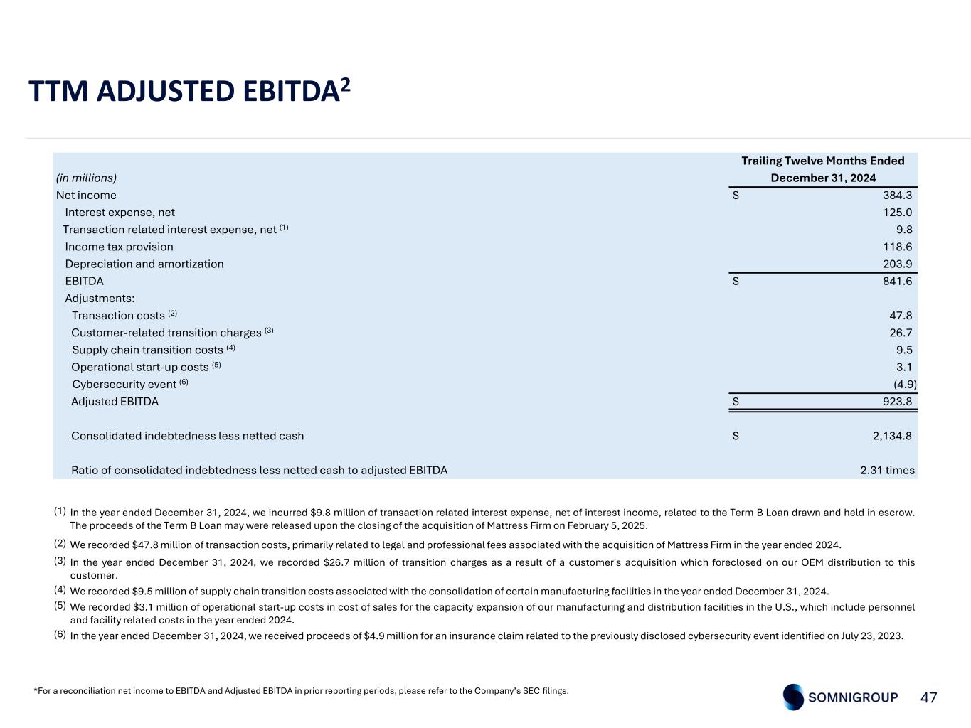 46 ADJUSTED EBITDA2 *For a reconciliation net income to EBITDA and Adjusted EBITDA in prior reporting periods, please refer to the Company’s SEC filings. Three Months Ended (in millions) December 31, 2024 December 31, 2023 Net income $ 71.9 $ 77.1 Interest expense, net 26.5 30.9 Transaction related interest expense, net (1) 9.8 — Loss on extinguishment of debt (2) — 3.2 Income tax provision 23.1 9.9 Depreciation and amortization 53.0 48.0 EBITDA $ 184.3 $ 169.1 Adjustments: Customer-related transition charges (3) 26.7 — Transaction costs (4) 12.0 17.5 Supply chain transition costs (5) 1.3 — Cybersecurity event (6) (4.9) 0.8 Fair value remeasurement (7) — 11.0 Operational start-up costs (8) — 4.0 Adjusted EBITDA $ 219.4 $ 202.4 (1) In the fourth quarter of 2024, we incurred $9.8 million of transaction related interest expense, net of interest income, related to the Term B Loan drawn and held in escrow. The proceeds of the Term B Loan were released upon the closing of the acquisition of Mattress Firm on February 5, 2025. (2) In the fourth quarter of 2023, we recognized $3.2 million of loss on extinguishment of debt associated with the refinancing of our senior secured credit facilities. (3) In the fourth quarter of 2024, we recorded $26.7 million of transition charges as a result of a customer's acquisition which foreclosed on our OEM distribution to this customer. (4) We recorded $12.0 million and $17.5 million of transaction costs, primarily related to legal and professional fees associated with the acquisition of Mattress Firm, in the fourth quarters of 2024 and 2023, respectively. (5) We recorded $1.3 million of supply chain transition costs associated with the consolidation of certain manufacturing facilities in the fourth quarter of 2024. (6) In the fourth quarter of 2024, we received proceeds of $4.9 million for an insurance claim related to the previously disclosed cybersecurity event identified on July 23, 2023. We recorded $0.8 million of costs associated with the cybersecurity event identified on July 23, 2023 in the fourth quarter of 2023. (7) In the fourth quarter of 2023, we recorded a fair value remeasurement of $11.0 million related to a strategic investment in a product innovation initiative. (8) We recorded $4.0 million of operational start-up costs related to the capacity expansion of its manufacturing and distribution facilities in the U.S. in the fourth quarter of 2023.
