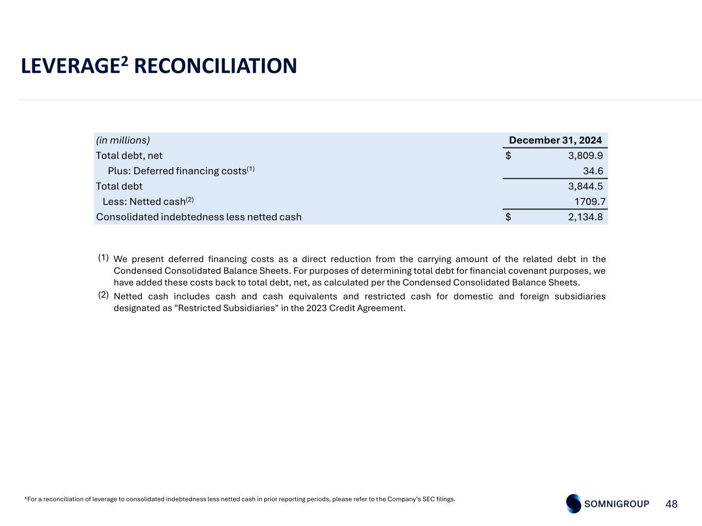 47 TTM ADJUSTED EBITDA2 *For a reconciliation net income to EBITDA and Adjusted EBITDA in prior reporting periods, please refer to the Company’s SEC filings. Trailing Twelve Months Ended (in millions) December 31, 2024 Net income $ 384.3 Interest expense, net 125.0 Transaction related interest expense, net (1) 9.8 Income tax provision 118.6 Depreciation and amortization 203.9 EBITDA $ 841.6 Adjustments: Transaction costs (2) 47.8 Customer-related transition charges (3) 26.7 Supply chain transition costs (4) 9.5 Operational start-up costs (5) 3.1 Cybersecurity event (6) (4.9) Adjusted EBITDA $ 923.8 Consolidated indebtedness less netted cash $ 2,134.8 Ratio of consolidated indebtedness less netted cash to adjusted EBITDA 2.31 times (1) In the year ended December 31, 2024, we incurred $9.8 million of transaction related interest expense, net of interest income, related to the Term B Loan drawn and held in escrow. The proceeds of the Term B Loan may were released upon the closing of the acquisition of Mattress Firm on February 5, 2025. (2) We recorded $47.8 million of transaction costs, primarily related to legal and professional fees associated with the acquisition of Mattress Firm in the year ended 2024. (3) In the year ended December 31, 2024, we recorded $26.7 million of transition charges as a result of a customer's acquisition which foreclosed on our OEM distribution to this customer. (4) We recorded $9.5 million of supply chain transition costs associated with the consolidation of certain manufacturing facilities in the year ended December 31, 2024. (5) We recorded $3.1 million of operational start-up costs in cost of sales for the capacity expansion of our manufacturing and distribution facilities in the U.S., which include personnel and facility related costs in the year ended 2024. (6) In the year ended December 31, 2024, we received proceeds of $4.9 million for an insurance claim related to the previously disclosed cybersecurity event identified on July 23, 2023.
