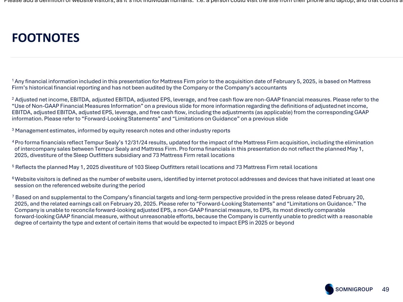 49 FOOTNOTES 1 Any financial information included in this presentation for Mattress Firm prior to the acquisition date of February 5, 2025, is based on Mattress Firm’s historical financial reporting and has not been audited by the Company or the Company’s accountants 2 Adjusted net income, EBITDA, adjusted EBITDA, adjusted EPS, leverage, and free cash flow are non-GAAP financial measures. Please refer to the “Use of Non-GAAP Financial Measures Information” on a previous slide for more information regarding the definitions of adjusted net income, EBITDA, adjusted EBITDA, adjusted EPS, leverage, and free cash flow, including the adjustments (as applicable) from the corresponding GAAP information. Please refer to “Forward-Looking Statements” and “Limitations on Guidance” on a previous slide 3 Management estimates, informed by equity research notes and other industry reports 4 Pro forma financials reflect Tempur Sealy’s 12/31/24 results, updated for the impact of the Mattress Firm acquisition, including the elimination of intercompany sales between Tempur Sealy and Mattress Firm. Pro forma financials in this presentation do not reflect the planned May 1, 2025, divestiture of the Sleep Outfitters subsidiary and 73 Mattress Firm retail locations 5 Reflects the planned May 1, 2025 divestiture of 103 Sleep Outfitters retail locations and 73 Mattress Firm retail locations 6 Website visitors is defined as the number of website users, identified by internet protocol addresses and devices that have initiated at least one session on the referenced website during the period 7 Based on and supplemental to the Company’s financial targets and long-term perspective provided in the press release dated February 20, 2025, and the related earnings call on February 20, 2025. Please refer to “Forward-Looking Statements” and “Limitations on Guidance.” The Company is unable to reconcile forward‐looking adjusted EPS, a non‐GAAP financial measure, to EPS, its most directly comparable forward‐looking GAAP financial measure, without unreasonable efforts, because the Company is currently unable to predict with a reasonable degree of certainty the type and extent of certain items that would be expected to impact EPS in 2025 or beyond Please add a definition of website visitors, as it’s not individual humans. I.e. a person could visit the site from their phone and laptop, and that counts as two visits.
