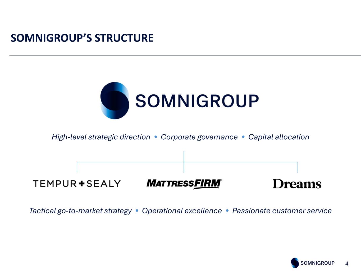 In February 2025, the Company was reimagined, and Somnigroup International Inc. was founded, reflecting the transformative nature of the Mattress Firm acquisition. Somnigroup provides sleep solutions with a portfolio of outstanding businesses with iconic brands. SOMN = sleep OMNI = omnichannel GROUP = company comprised of multiple subsidiaries enriching people’s lives through the power of a good night’s sleep 3 ABOUT SOMNIGROUP