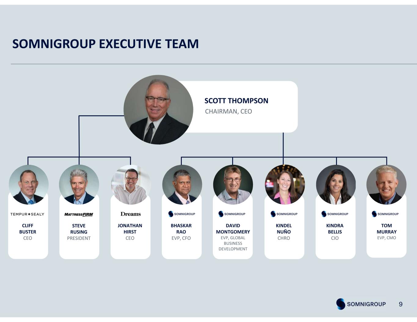 KINDRA BELLIS CIO DAVID MONTGOMERY EVP, GLOBAL BUSINESS DEVELOPMENT SOMNIGROUP EXECUTIVE TEAM 9 SCOTT THOMPSON CHAIRMAN, CEO CLIFF BUSTER CEO STEVE RUSING PRESIDENT JONATHAN HIRST CEO TOM MURRAY EVP, CMO KINDEL NUÑO CHRO BHASKAR RAO EVP, CFO