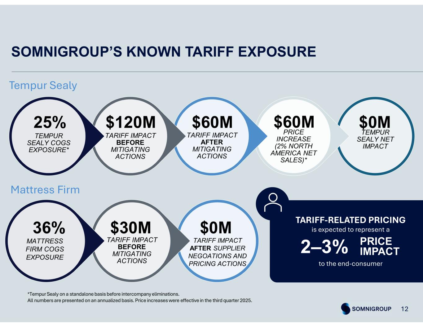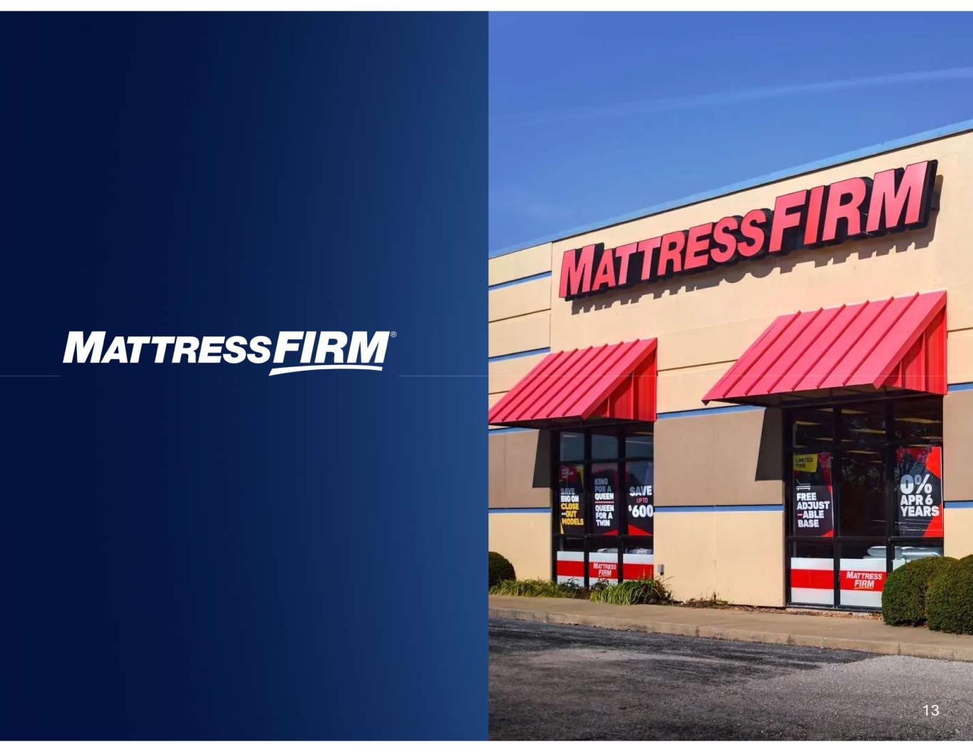 SOMNIGROUP’S KNOWN TARIFF EXPOSURE TARIFF IMPACT BEFORE MITIGATING ACTIONS TEMPUR SEALY NET IMPACT PRICE INCREASE (2% NORTH AMERICA NET SALES)* TARIFF IMPACT AFTER MITIGATING ACTIONS TARIFF IMPACT BEFORE MITIGATING ACTIONS TEMPUR SEALY COGS EXPOSURE* $120M25% $60M $60M $0M 12 Tempur Sealy *Tempur Sealy on a standalone basis before intercompany eliminations. All numbers are presented on an annualized basis. Price increases were effective in the third quarter 2025. Mattress Firm $30M36% $0M TARIFF IMPACT AFTER SUPPLIER NEGOATIONS AND PRICING ACTIONS MATTRESS FIRM COGS EXPOSURE TARIFF-RELATED PRICING is expected to represent a to the end-consumer 2–3% PRICE IMPACT