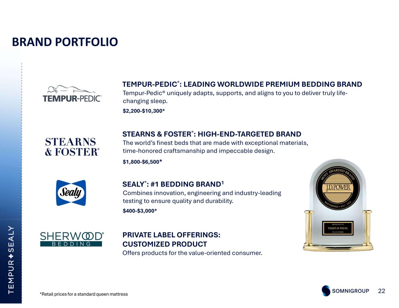 BRAND PORTFOLIO 22 TEMPUR-PEDIC®: LEADING WORLDWIDE PREMIUM BEDDING BRAND Tempur-Pedic® uniquely adapts, supports, and aligns to you to deliver truly life- changing sleep. $2,200-$10,300* STEARNS & FOSTER®: HIGH-END-TARGETED BRAND The world’s finest beds that are made with exceptional materials, time-honored craftsmanship and impeccable design. $1,800-$6,500* SEALY®: #1 BEDDING BRAND1 Combines innovation, engineering and industry-leading testing to ensure quality and durability. $400-$3,000* PRIVATE LABEL OFFERINGS: CUSTOMIZED PRODUCT Offers products for the value-oriented consumer. *Retail prices for a standard queen mattress
