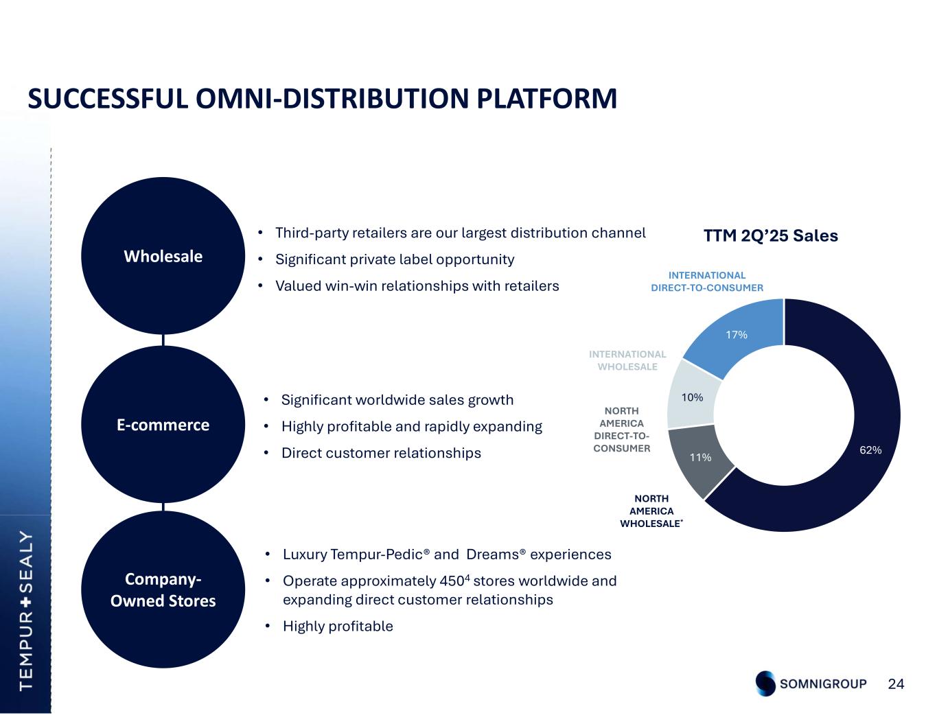 TTM 2Q’25 Sales SUCCESSFUL OMNI-DISTRIBUTION PLATFORM 24 • Significant worldwide sales growth • Highly profitable and rapidly expanding • Direct customer relationships E-commerce • Luxury Tempur-Pedic® and Dreams® experiences • Operate approximately 4504 stores worldwide and expanding direct customer relationships • Highly profitable Company- Owned Stores • Third-party retailers are our largest distribution channel • Significant private label opportunity • Valued win-win relationships with retailers Wholesale NORTH AMERICA WHOLESALE* NORTH AMERICA DIRECT-TO- CONSUMER INTERNATIONAL WHOLESALE INTERNATIONAL DIRECT-TO-CONSUMER 62% 11% 10% 17%