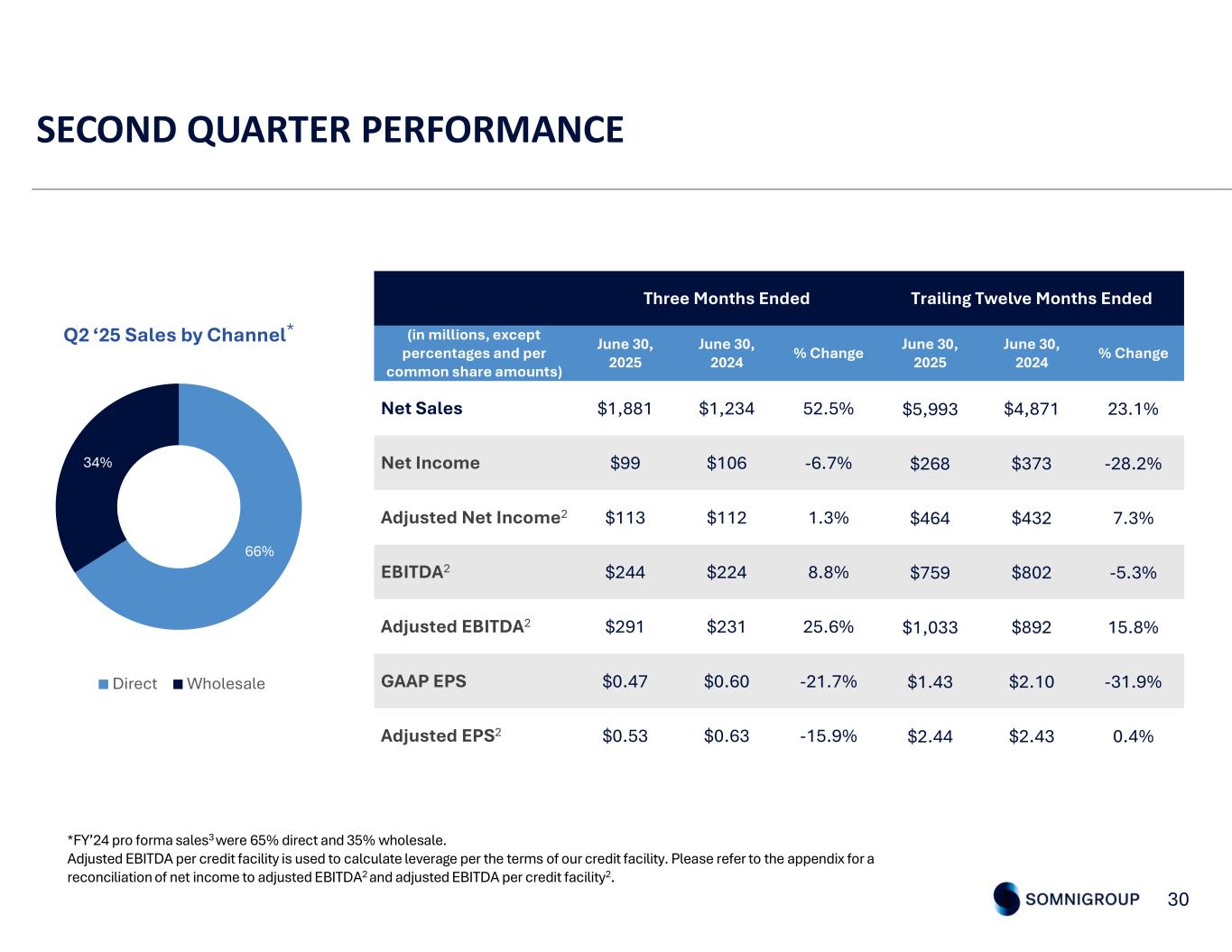 SECOND QUARTER PERFORMANCE 30 Trailing Twelve Months EndedThree Months Ended % ChangeJune 30, 2024 June 30, 2025% ChangeJune 30, 2024 June 30, 2025 (in millions, except percentages and per common share amounts) 23.1%$4,871$5,99352.5%$1,234$1,881Net Sales -28.2%$373$268-6.7%$106$99Net Income 7.3%$432$4641.3%$112$113Adjusted Net Income2 -5.3%$802$7598.8%$224$244EBITDA2 15.8%$892$1,03325.6%$231$291Adjusted EBITDA2 -31.9%$2.10$1.43-21.7%$0.60$0.47GAAP EPS 0.4%$2.43$2.44-15.9%$0.63$0.53Adjusted EPS2 Q2 ‘25 Sales by Channel* 66% 34% Direct Wholesale *FY’24 pro forma sales3 were 65% direct and 35% wholesale. Adjusted EBITDA per credit facility is used to calculate leverage per the terms of our credit facility. Please refer to the appendix for a reconciliation of net income to adjusted EBITDA2 and adjusted EBITDA per credit facility2.