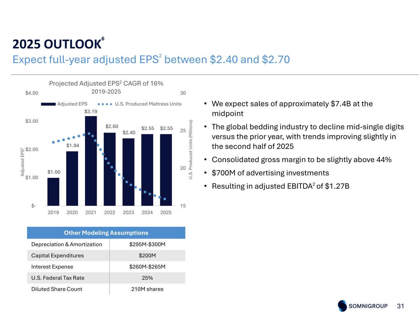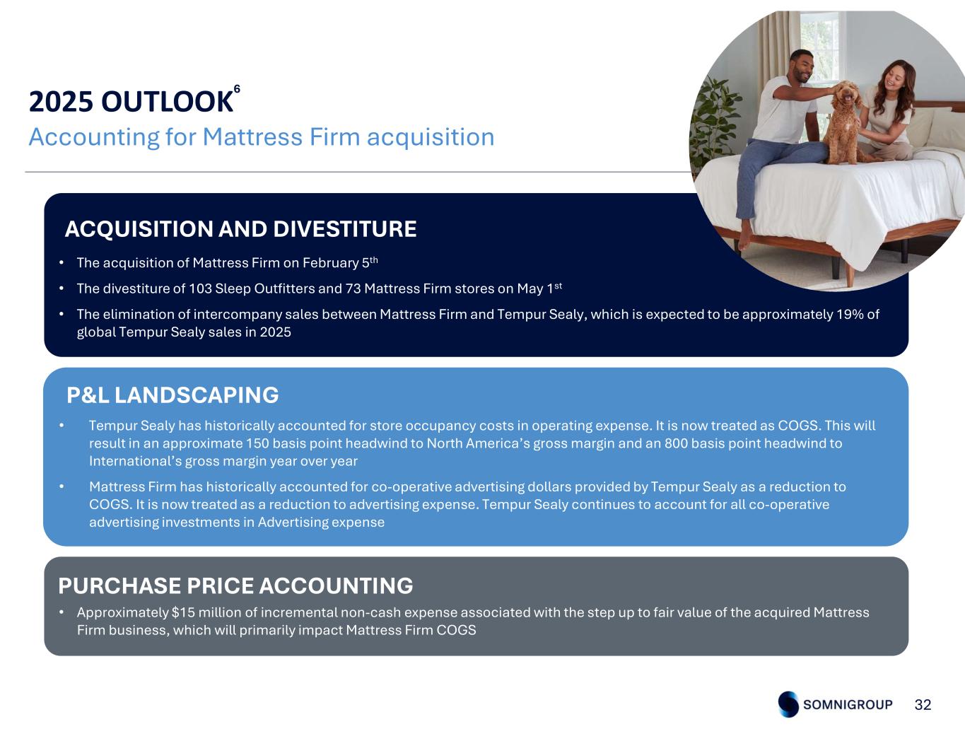 2025 OUTLOOK6 31 Expect full-year adjusted EPS2 between $2.40 and $2.70 Other Modeling Assumptions $295M-$300MDepreciation & Amortization $200MCapital Expenditures $260M-$265MInterest Expense 25%U.S. Federal Tax Rate 210M sharesDiluted Share Count • We expect sales of approximately $7.4B at the midpoint • The global bedding industry to decline mid-single digits versus the prior year, with trends improving slightly in the second half of 2025 • Consolidated gross margin to be slightly above 44% • $700M of advertising investments • Resulting in adjusted EBITDA2 of $1.27B $1.00 $1.94 $3.19 $2.60 $2.40 $2.55 $2.55 15 20 25 30 $- $1.00 $2.00 $3.00 $4.00 2019 2020 2021 2022 2023 2024 2025 U .S . P ro du ce d U ni ts (M ill io ns ) Ad ju st ed E PS 2 Projected Adjusted EPS2 CAGR of 16% 2019-2025 Adjusted EPS U.S. Produced Mattress Units