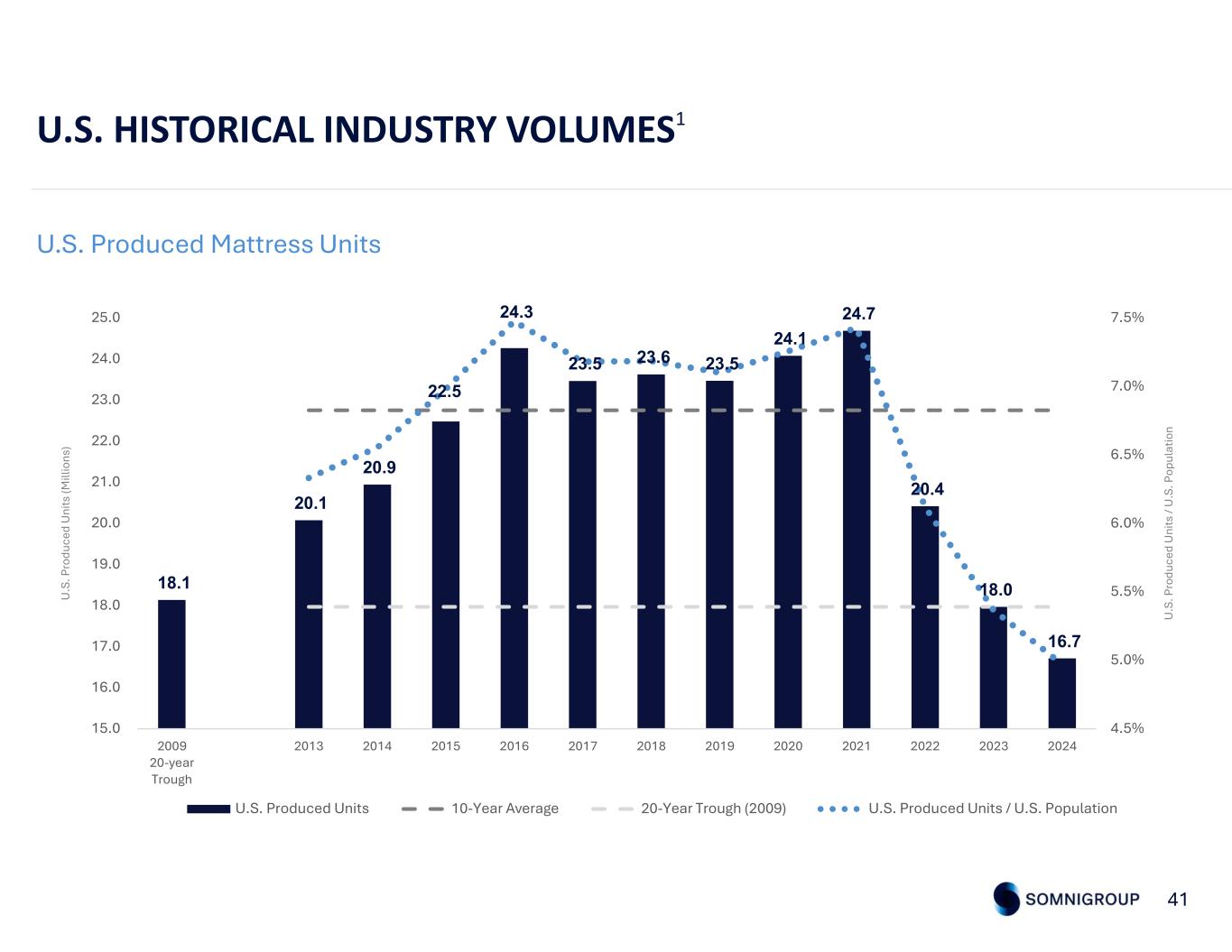 U.S. HISTORICAL INDUSTRY VOLUMES1 41 U.S. Produced Mattress Units Source: ISPA, U.S. ITC, management estimates 18.1 20.1 20.9 22.5 24.3 23.5 23.6 23.5 24.1 24.7 20.4 18.0 16.7 4.5% 5.0% 5.5% 6.0% 6.5% 7.0% 7.5% 15.0 16.0 17.0 18.0 19.0 20.0 21.0 22.0 23.0 24.0 25.0 2009 20-year Trough 2013 2014 2015 2016 2017 2018 2019 2020 2021 2022 2023 2024 U .S . P ro du ce d U ni ts / U .S . P op ul at io n U .S . P ro du ce d U ni ts (M ill io ns ) U.S. Produced Units 10-Year Average 20-Year Trough (2009) U.S. Produced Units / U.S. Population