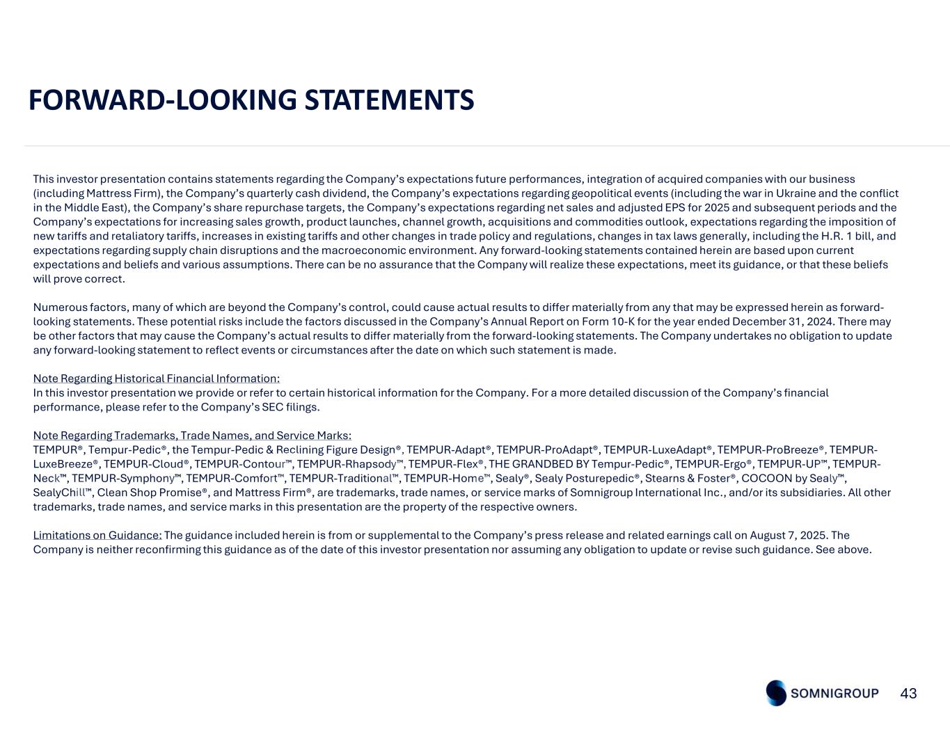 43 This investor presentation contains statements regarding the Company’s expectations future performances, integration of acquired companies with our business (including Mattress Firm), the Company’s quarterly cash dividend, the Company’s expectations regarding geopolitical events (including the war in Ukraine and the conflict in the Middle East), the Company’s share repurchase targets, the Company’s expectations regarding net sales and adjusted EPS for 2025 and subsequent periods and the Company’s expectations for increasing sales growth, product launches, channel growth, acquisitions and commodities outlook, expectations regarding the imposition of new tariffs and retaliatory tariffs, increases in existing tariffs and other changes in trade policy and regulations, changes in tax laws generally, including the H.R. 1 bill, and expectations regarding supply chain disruptions and the macroeconomic environment. Any forward-looking statements contained herein are based upon current expectations and beliefs and various assumptions. There can be no assurance that the Company will realize these expectations, meet its guidance, or that these beliefs will prove correct. Numerous factors, many of which are beyond the Company’s control, could cause actual results to differ materially from any that may be expressed herein as forward- looking statements. These potential risks include the factors discussed in the Company’s Annual Report on Form 10-K for the year ended December 31, 2024. There may be other factors that may cause the Company’s actual results to differ materially from the forward-looking statements. The Company undertakes no obligation to update any forward-looking statement to reflect events or circumstances after the date on which such statement is made. Note Regarding Historical Financial Information: In this investor presentation we provide or refer to certain historical information for the Company. For a more detailed discussion of the Company’s financial performance, please refer to the Company’s SEC filings. Note Regarding Trademarks, Trade Names, and Service Marks: TEMPUR®, Tempur-Pedic®, the Tempur-Pedic & Reclining Figure Design®, TEMPUR-Adapt®, TEMPUR-ProAdapt®, TEMPUR-LuxeAdapt®, TEMPUR-ProBreeze®, TEMPUR- LuxeBreeze®, TEMPUR-Cloud®, TEMPUR-Contour , TEMPUR-Rhapsody , TEMPUR-Flex®, THE GRANDBED BY Tempur-Pedic®, TEMPUR-Ergo®, TEMPUR-UP , TEMPUR- Neck , TEMPUR-Symphony , TEMPUR-Comfort , TEMPUR-Traditional , TEMPUR-Home , Sealy®, Sealy Posturepedic®, Stearns & Foster®, COCOON by Sealy , SealyChill , Clean Shop Promise®, and Mattress Firm®, are trademarks, trade names, or service marks of Somnigroup International Inc., and/or its subsidiaries. All other trademarks, trade names, and service marks in this presentation are the property of the respective owners. Limitations on Guidance: The guidance included herein is from or supplemental to the Company’s press release and related earnings call on August 7, 2025. The Company is neither reconfirming this guidance as of the date of this investor presentation nor assuming any obligation to update or revise such guidance. See above. FORWARD-LOOKING STATEMENTS