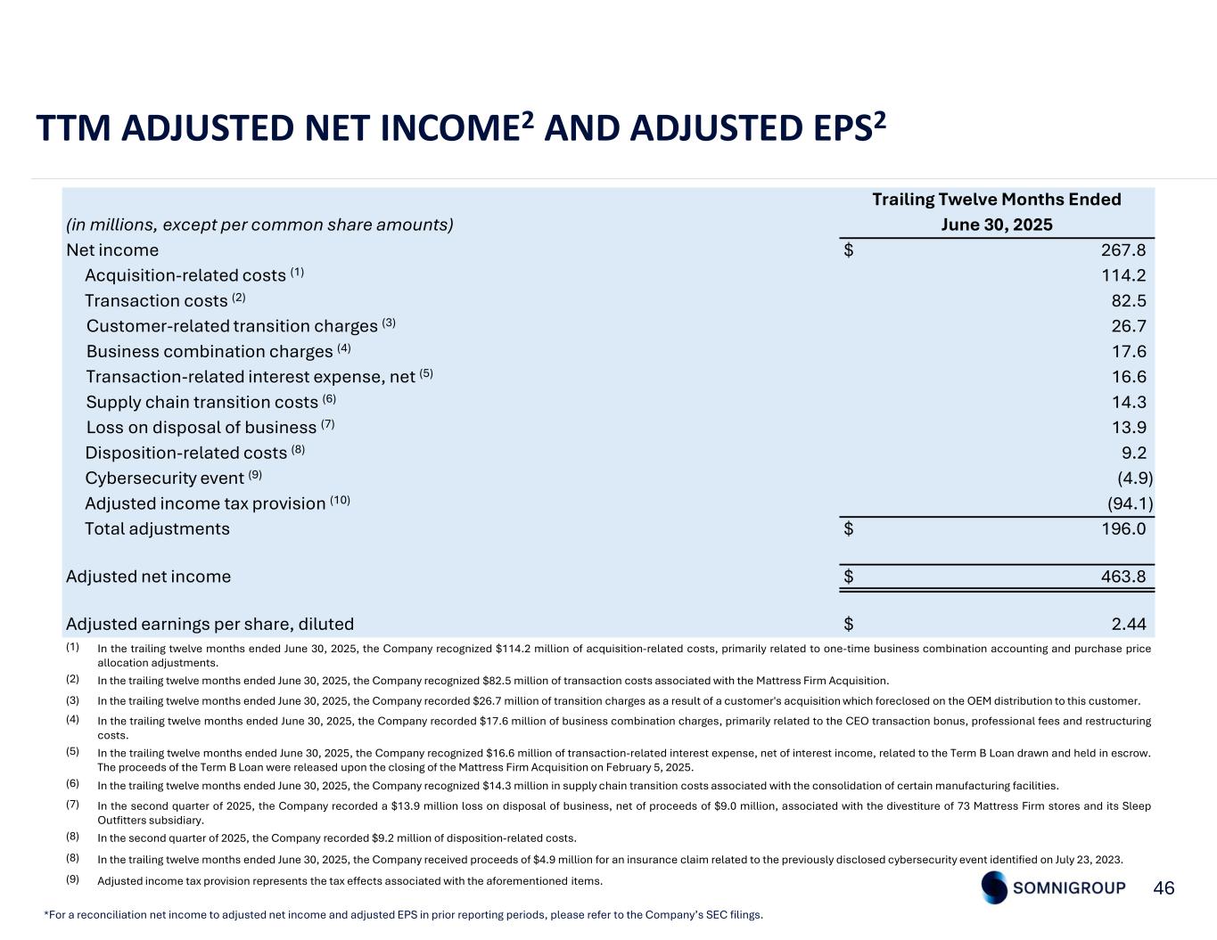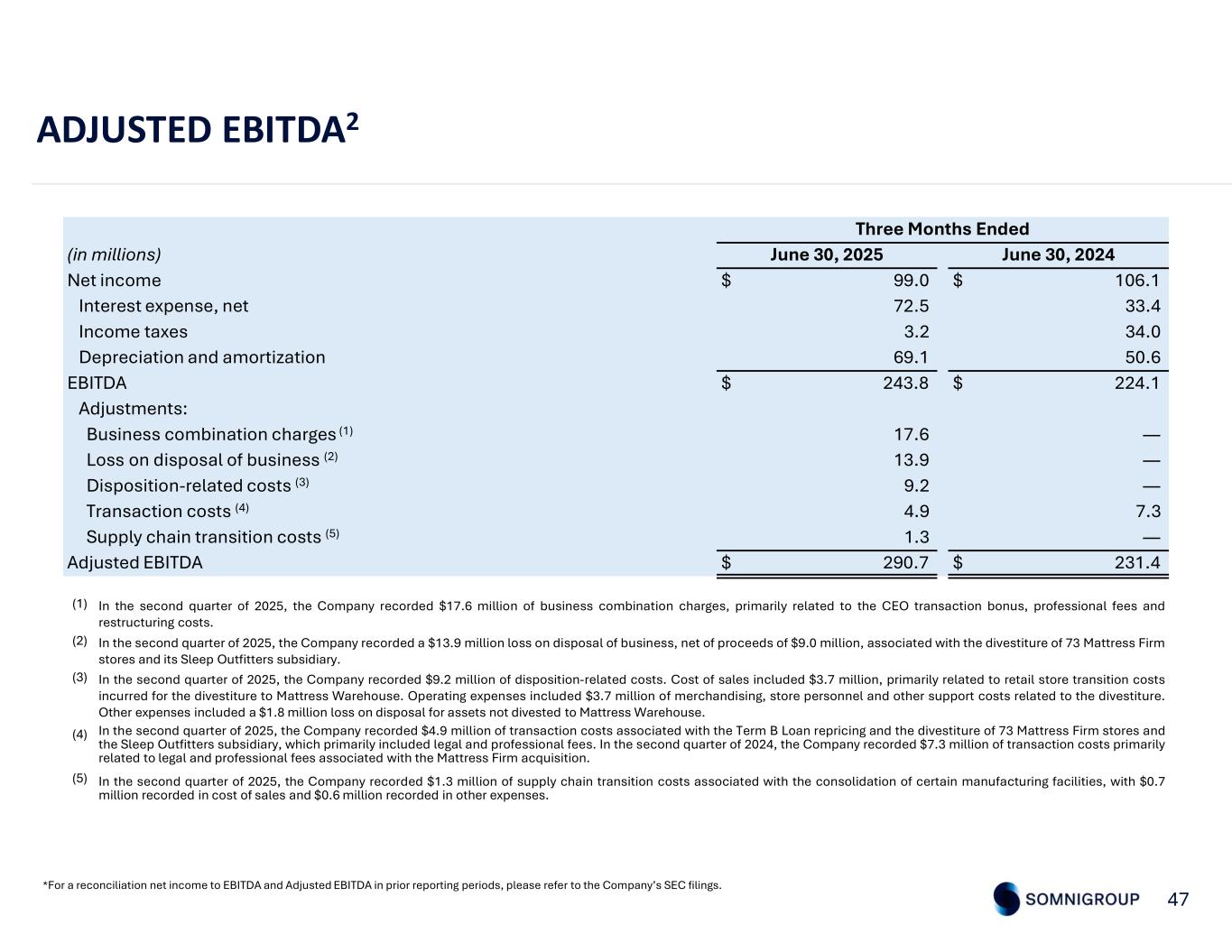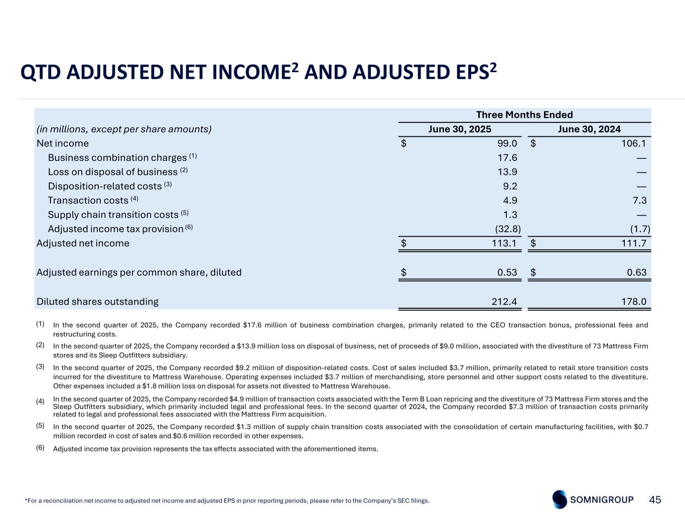 Three Months Ended June 30, 2024June 30, 2025(in millions, except per share amounts) $ 106.1$ 99.0Net income —17.6Business combination charges (1) —13.9Loss on disposal of business (2) —9.2Disposition-related costs (3) 7.34.9Transaction costs (4) —1.3Supply chain transition costs (5) (1.7)(32.8)Adjusted income tax provision (6) $ 111.7$ 113.1Adjusted net income $ 0.63$ 0.53Adjusted earnings per common share, diluted 178.0212.4Diluted shares outstanding 45 QTD ADJUSTED NET INCOME2 AND ADJUSTED EPS2 *For a reconciliation net income to adjusted net income and adjusted EPS in prior reporting periods, please refer to the Company’s SEC filings. In the second quarter of 2025, the Company recorded $17.6 million of business combination charges, primarily related to the CEO transaction bonus, professional fees and restructuring costs. (1) In the second quarter of 2025, the Company recorded a $13.9 million loss on disposal of business, net of proceeds of $9.0 million, associated with the divestiture of 73 Mattress Firm stores and its Sleep Outfitters subsidiary. (2) In the second quarter of 2025, the Company recorded $9.2 million of disposition-related costs. Cost of sales included $3.7 million, primarily related to retail store transition costs incurred for the divestiture to Mattress Warehouse. Operating expenses included $3.7 million of merchandising, store personnel and other support costs related to the divestiture. Other expenses included a $1.8 million loss on disposal for assets not divested to Mattress Warehouse. (3) In the second quarter of 2025, the Company recorded $4.9 million of transaction costs associated with the Term B Loan repricing and the divestiture of 73 Mattress Firm stores and the Sleep Outfitters subsidiary, which primarily included legal and professional fees. In the second quarter of 2024, the Company recorded $7.3 million of transaction costs primarily related to legal and professional fees associated with the Mattress Firm acquisition. (4) In the second quarter of 2025, the Company recorded $1.3 million of supply chain transition costs associated with the consolidation of certain manufacturing facilities, with $0.7 million recorded in cost of sales and $0.6 million recorded in other expenses. (5) Adjusted income tax provision represents the tax effects associated with the aforementioned items.(6)