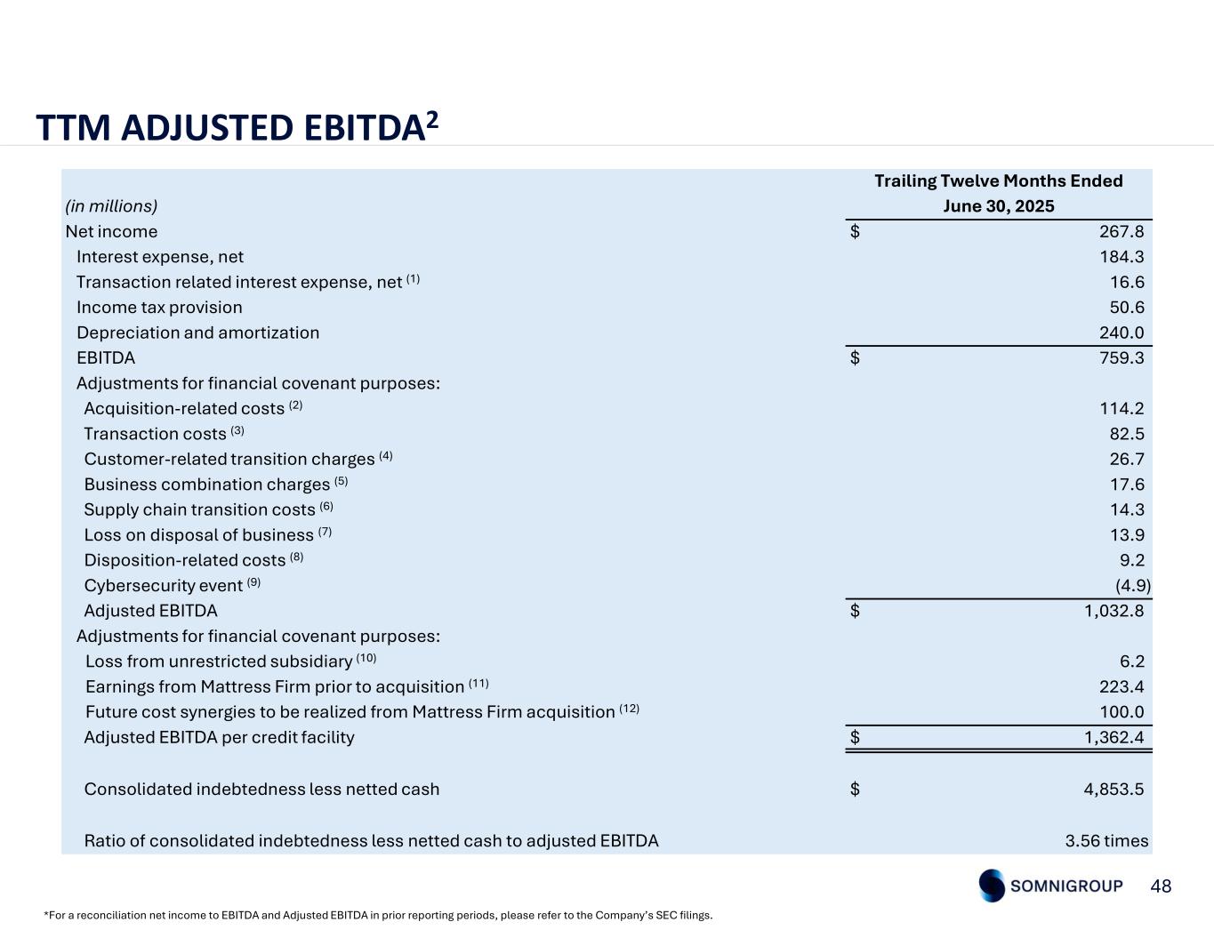 47 ADJUSTED EBITDA2 *For a reconciliation net income to EBITDA and Adjusted EBITDA in prior reporting periods, please refer to the Company’s SEC filings. In the second quarter of 2025, the Company recorded $17.6 million of business combination charges, primarily related to the CEO transaction bonus, professional fees and restructuring costs. (1) In the second quarter of 2025, the Company recorded a $13.9 million loss on disposal of business, net of proceeds of $9.0 million, associated with the divestiture of 73 Mattress Firm stores and its Sleep Outfitters subsidiary. (2) In the second quarter of 2025, the Company recorded $9.2 million of disposition-related costs. Cost of sales included $3.7 million, primarily related to retail store transition costs incurred for the divestiture to Mattress Warehouse. Operating expenses included $3.7 million of merchandising, store personnel and other support costs related to the divestiture. Other expenses included a $1.8 million loss on disposal for assets not divested to Mattress Warehouse. (3) In the second quarter of 2025, the Company recorded $4.9 million of transaction costs associated with the Term B Loan repricing and the divestiture of 73 Mattress Firm stores and the Sleep Outfitters subsidiary, which primarily included legal and professional fees. In the second quarter of 2024, the Company recorded $7.3 million of transaction costs primarily related to legal and professional fees associated with the Mattress Firm acquisition. (4) In the second quarter of 2025, the Company recorded $1.3 million of supply chain transition costs associated with the consolidation of certain manufacturing facilities, with $0.7 million recorded in cost of sales and $0.6 million recorded in other expenses. (5) Three Months Ended June 30, 2024June 30, 2025(in millions) $ 106.1$ 99.0Net income 33.472.5Interest expense, net 34.03.2Income taxes 50.669.1Depreciation and amortization $ 224.1$ 243.8EBITDA Adjustments: —17.6Business combination charges (1) —13.9Loss on disposal of business (2) —9.2Disposition-related costs (3) 7.34.9Transaction costs (4) —1.3Supply chain transition costs (5) $ 231.4$ 290.7Adjusted EBITDA