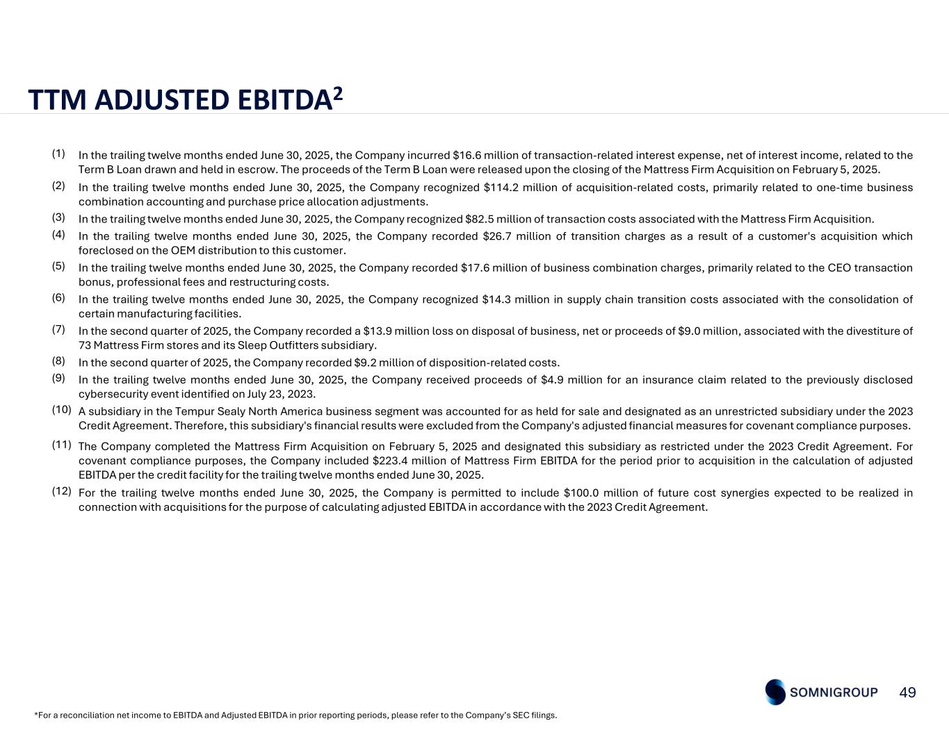 48 TTM ADJUSTED EBITDA2 *For a reconciliation net income to EBITDA and Adjusted EBITDA in prior reporting periods, please refer to the Company’s SEC filings. Trailing Twelve Months Ended June 30, 2025(in millions) $ 267.8Net income 184.3Interest expense, net 16.6Transaction related interest expense, net (1) 50.6Income tax provision 240.0Depreciation and amortization $ 759.3EBITDA Adjustments for financial covenant purposes: 114.2Acquisition-related costs (2) 82.5Transaction costs (3) 26.7Customer-related transition charges (4) 17.6Business combination charges (5) 14.3Supply chain transition costs (6) 13.9Loss on disposal of business (7) 9.2Disposition-related costs (8) (4.9)Cybersecurity event (9) $ 1,032.8Adjusted EBITDA Adjustments for financial covenant purposes: 6.2Loss from unrestricted subsidiary (10) 223.4Earnings from Mattress Firm prior to acquisition (11) 100.0Future cost synergies to be realized from Mattress Firm acquisition (12) $ 1,362.4Adjusted EBITDA per credit facility $ 4,853.5Consolidated indebtedness less netted cash 3.56 timesRatio of consolidated indebtedness less netted cash to adjusted EBITDA