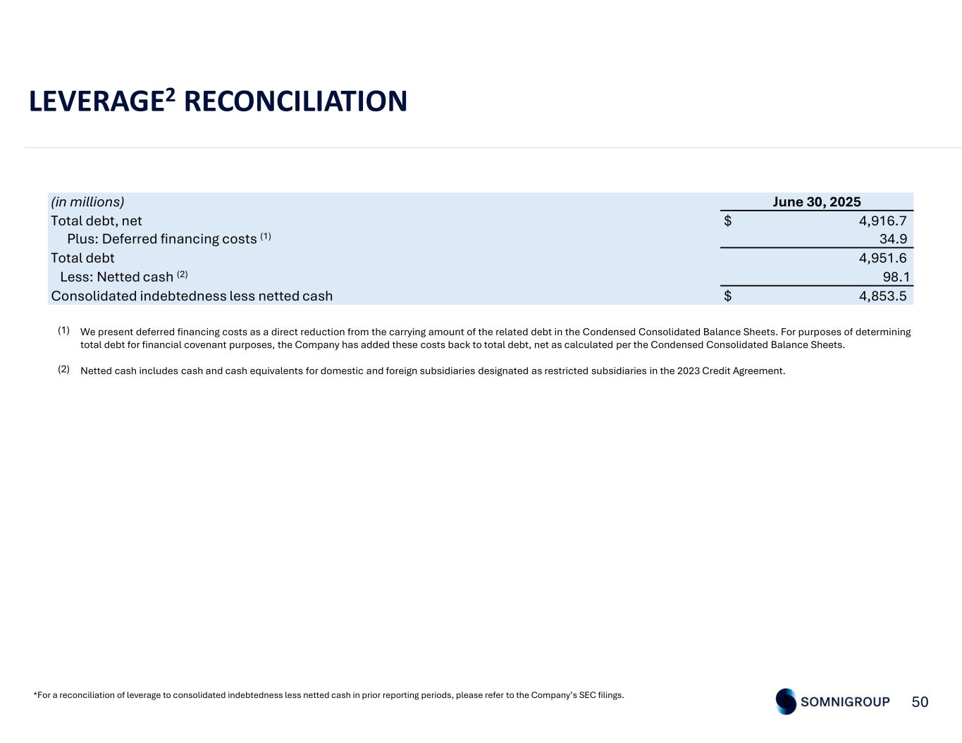 50 LEVERAGE2 RECONCILIATION *For a reconciliation of leverage to consolidated indebtedness less netted cash in prior reporting periods, please refer to the Company’s SEC filings. We present deferred financing costs as a direct reduction from the carrying amount of the related debt in the Condensed Consolidated Balance Sheets. For purposes of determining total debt for financial covenant purposes, the Company has added these costs back to total debt, net as calculated per the Condensed Consolidated Balance Sheets. (1) Netted cash includes cash and cash equivalents for domestic and foreign subsidiaries designated as restricted subsidiaries in the 2023 Credit Agreement.(2) June 30, 2025(in millions) $ 4,916.7Total debt, net 34.9Plus: Deferred financing costs (1) 4,951.6Total debt 98.1Less: Netted cash (2) $ 4,853.5Consolidated indebtedness less netted cash