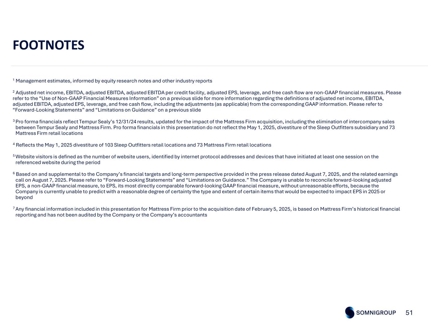 51 FOOTNOTES 1 Management estimates, informed by equity research notes and other industry reports 2 Adjusted net income, EBITDA, adjusted EBITDA, adjusted EBITDA per credit facility, adjusted EPS, leverage, and free cash flow are non-GAAP financial measures. Please refer to the “Use of Non-GAAP Financial Measures Information” on a previous slide for more information regarding the definitions of adjusted net income, EBITDA, adjusted EBITDA, adjusted EPS, leverage, and free cash flow, including the adjustments (as applicable) from the corresponding GAAP information. Please refer to “Forward-Looking Statements” and “Limitations on Guidance” on a previous slide 3 Pro forma financials reflect Tempur Sealy’s 12/31/24 results, updated for the impact of the Mattress Firm acquisition, including the elimination of intercompany sales between Tempur Sealy and Mattress Firm. Pro forma financials in this presentation do not reflect the May 1, 2025, divestiture of the Sleep Outfitters subsidiary and 73 Mattress Firm retail locations 4 Reflects the May 1, 2025 divestiture of 103 Sleep Outfitters retail locations and 73 Mattress Firm retail locations 5 Website visitors is defined as the number of website users, identified by internet protocol addresses and devices that have initiated at least one session on the referenced website during the period 6 Based on and supplemental to the Company’s financial targets and long-term perspective provided in the press release dated August 7, 2025, and the related earnings call on August 7, 2025. Please refer to “Forward-Looking Statements” and “Limitations on Guidance.” The Company is unable to reconcile forward‐looking adjusted EPS, a non‐GAAP financial measure, to EPS, its most directly comparable forward‐looking GAAP financial measure, without unreasonable efforts, because the Company is currently unable to predict with a reasonable degree of certainty the type and extent of certain items that would be expected to impact EPS in 2025 or beyond 7 Any financial information included in this presentation for Mattress Firm prior to the acquisition date of February 5, 2025, is based on Mattress Firm’s historical financial reporting and has not been audited by the Company or the Company’s accountants