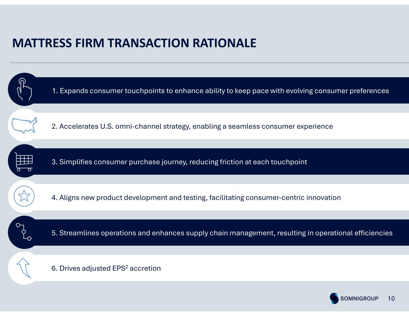 SOMNIGROUP 5 CONSUMER-CENTRIC INNOVATION DIVERSIFIED PORTFOLIO MANUFACTURING & LOGISTICS OMNI-CHANNEL RETAIL • Advanced R&D capabilities driving continuous solutions-based innovation • Diverse brand portfolio includes the most highly recognized brands in the industry • Global manufacturing footprint with advanced manufacturing and logistics capabilities • Leading bedding retailer in the U.S. and UK • Integrated brick- and-mortar and e-commerce ecosystem The world’s largest bedding company, dedicated to enriching people’s lives through the power of a great night’s sleep.