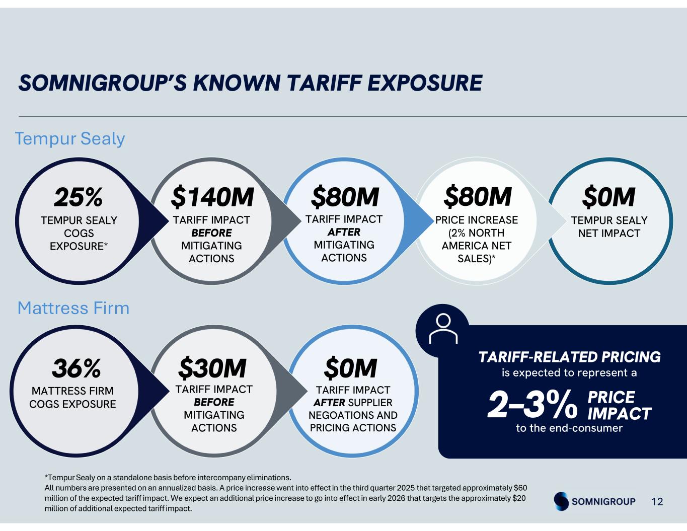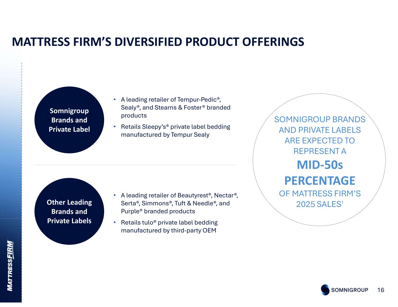 SOMNIGROUP’S KNOWN TARIFF EXPOSURE TARIFF IMPACT BEFORE MITIGATING ACTIONS TEMPUR SEALY NET IMPACT PRICE INCREASE (2% NORTH AMERICA NET SALES)* TARIFF IMPACT AFTER MITIGATING ACTIONS TARIFF IMPACT BEFORE MITIGATING ACTIONS TEMPUR SEALY COGS EXPOSURE* $140M25% $80M $80M $0M 12 Tempur Sealy *Tempur Sealy on a standalone basis before intercompany eliminations. All numbers are presented on an annualized basis. A price increase went into effect in the third quarter 2025 that targeted approximately $60 million of the expected tariff impact. We expect an additional price increase to go into effect in early 2026 that targets the approximately $20 million of additional expected tariff impact. Mattress Firm $30M36% $0M TARIFF IMPACT AFTER SUPPLIER NEGOATIONS AND PRICING ACTIONS MATTRESS FIRM COGS EXPOSURE TARIFF-RELATED PRICING is expected to represent a to the end-consumer 2–3% PRICE IMPACT