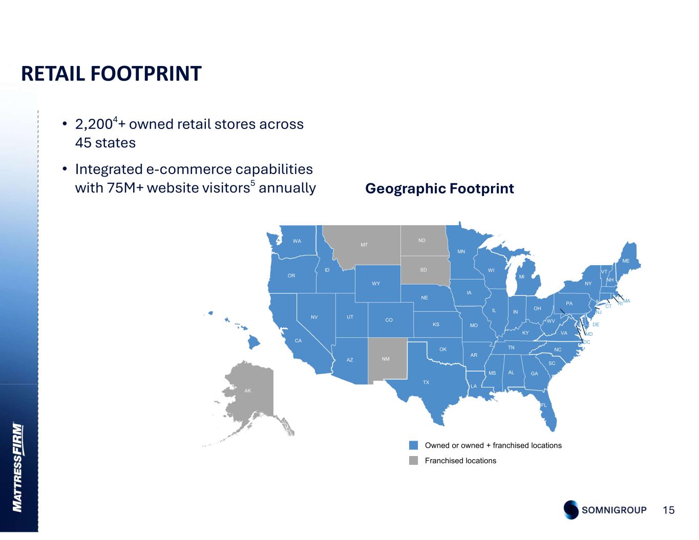 OVERVIEW – MATTRESS FIRM 14 LEADING OMNICHANNEL U.S. RETAILER 2,200+4 brick-and-mortar retail stores integrated with e- commerce and sleep education platforms to enable a seamless consumer purchase journey STRONG CONSUMER ENGAGEMENT Robust consumer touchpoints with deep insight into evolving preferences to optimize the consumer purchase journey and sustain consumer loyalty EXCEPTIONAL RETAIL TALENT 6,000+ highly trained retail sales associates facilitate an educational and effective end-to-end consumer purchase journey DIVERSIFIED PRODUCT OFFERING Leading brands and complementary private labels provide a range of innovative consumer solutions