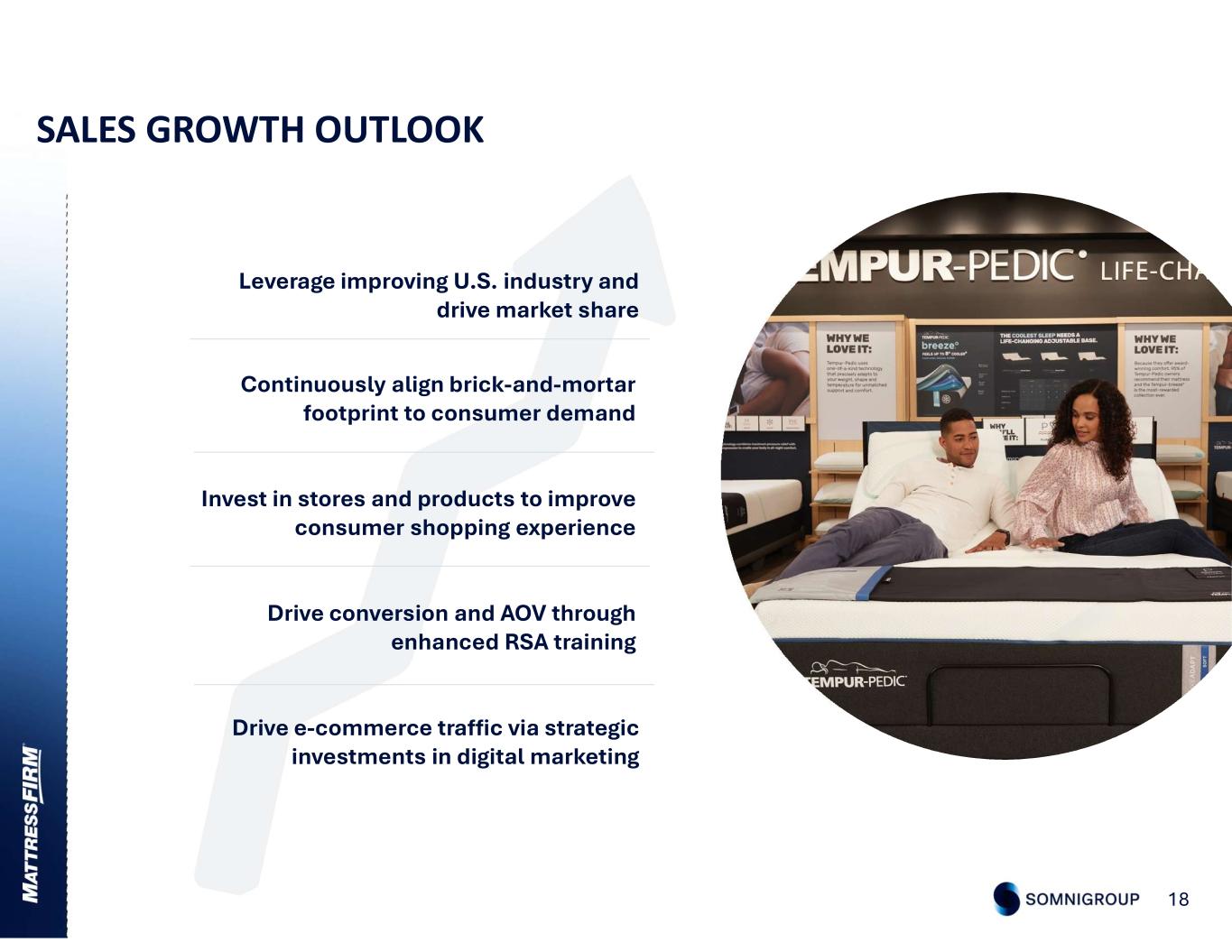 SCALE COMPETITIVE DIFFERENTIATORS 17 PRODUCT SELECTION Diverse and curated assortment CONVENIENCE Seamless experience nationwide on and offline RETAIL EXPERTISE Highly trained Sleep Experts EXPERIENCE Personalized to each consumer CONSUMER TOUCHPOINTS Data driven tools improving consumer outcomes LOGISTICS Accelerated order-to-deliver