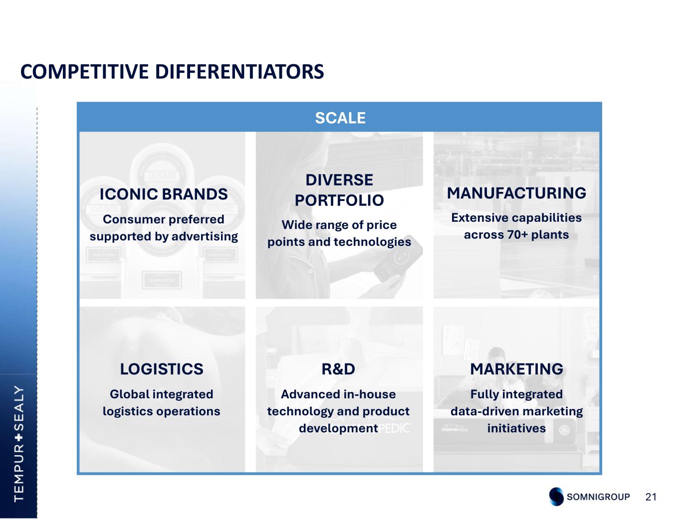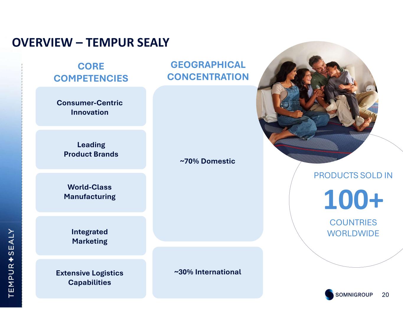 OVERVIEW – TEMPUR SEALY 20 CORE COMPETENCIES GEOGRAPHICAL CONCENTRATION PRODUCTS SOLD IN 100+ COUNTRIES WORLDWIDE Consumer-Centric Innovation Leading Product Brands World-Class Manufacturing Integrated Marketing Extensive Logistics Capabilities ~70% Domestic ~30% International