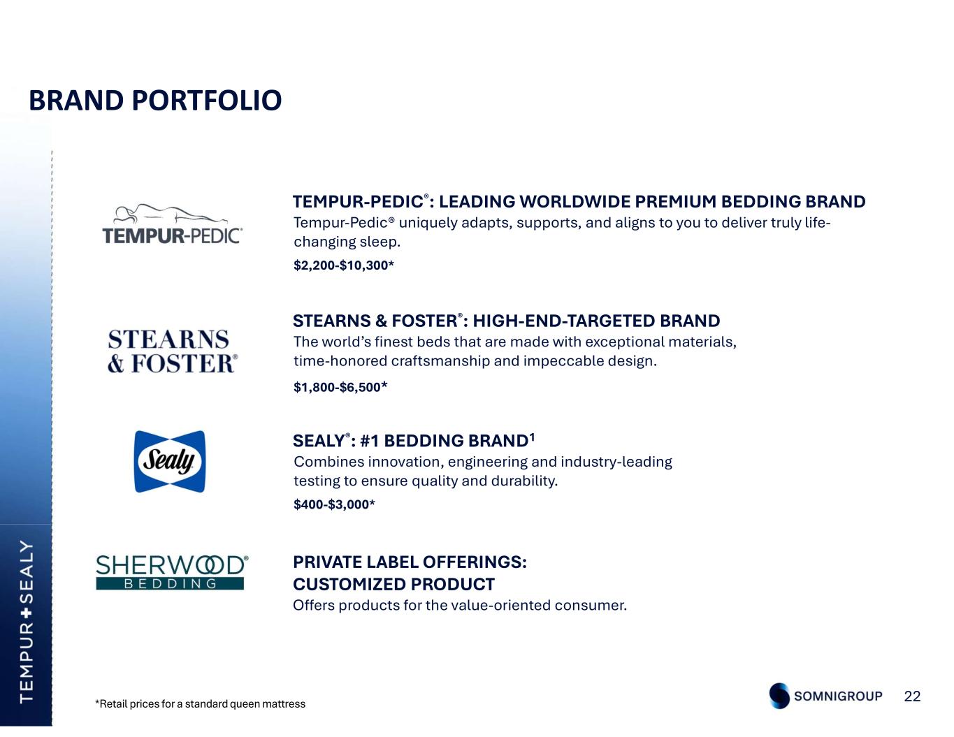 BRAND PORTFOLIO 22 TEMPUR-PEDIC®: LEADING WORLDWIDE PREMIUM BEDDING BRAND Tempur-Pedic® uniquely adapts, supports, and aligns to you to deliver truly life- changing sleep. $2,200-$10,300* STEARNS & FOSTER®: HIGH-END-TARGETED BRAND The world’s finest beds that are made with exceptional materials, time-honored craftsmanship and impeccable design. $1,800-$6,500* SEALY®: #1 BEDDING BRAND1 Combines innovation, engineering and industry-leading testing to ensure quality and durability. $400-$3,000* PRIVATE LABEL OFFERINGS: CUSTOMIZED PRODUCT Offers products for the value-oriented consumer. *Retail prices for a standard queen mattress