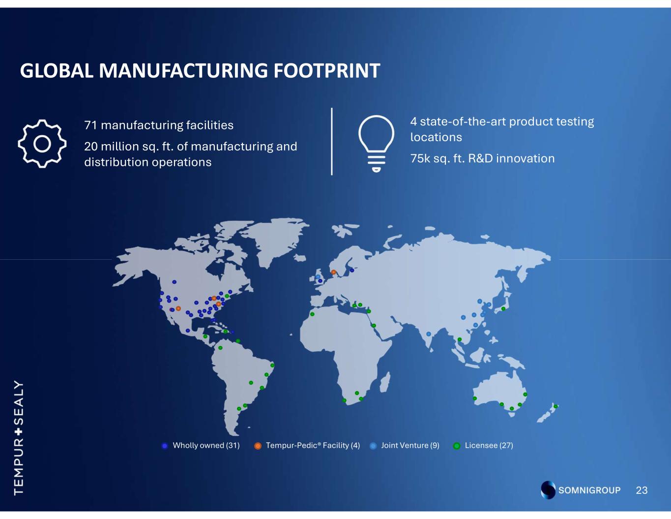 GLOBAL MANUFACTURING FOOTPRINT 23 71 manufacturing facilities 20 million sq. ft. of manufacturing and distribution operations 4 state-of-the-art product testing locations 75k sq. ft. R&D innovation Wholly owned (31) Joint Venture (9) Licensee (27)Tempur-Pedic® Facility (4)
