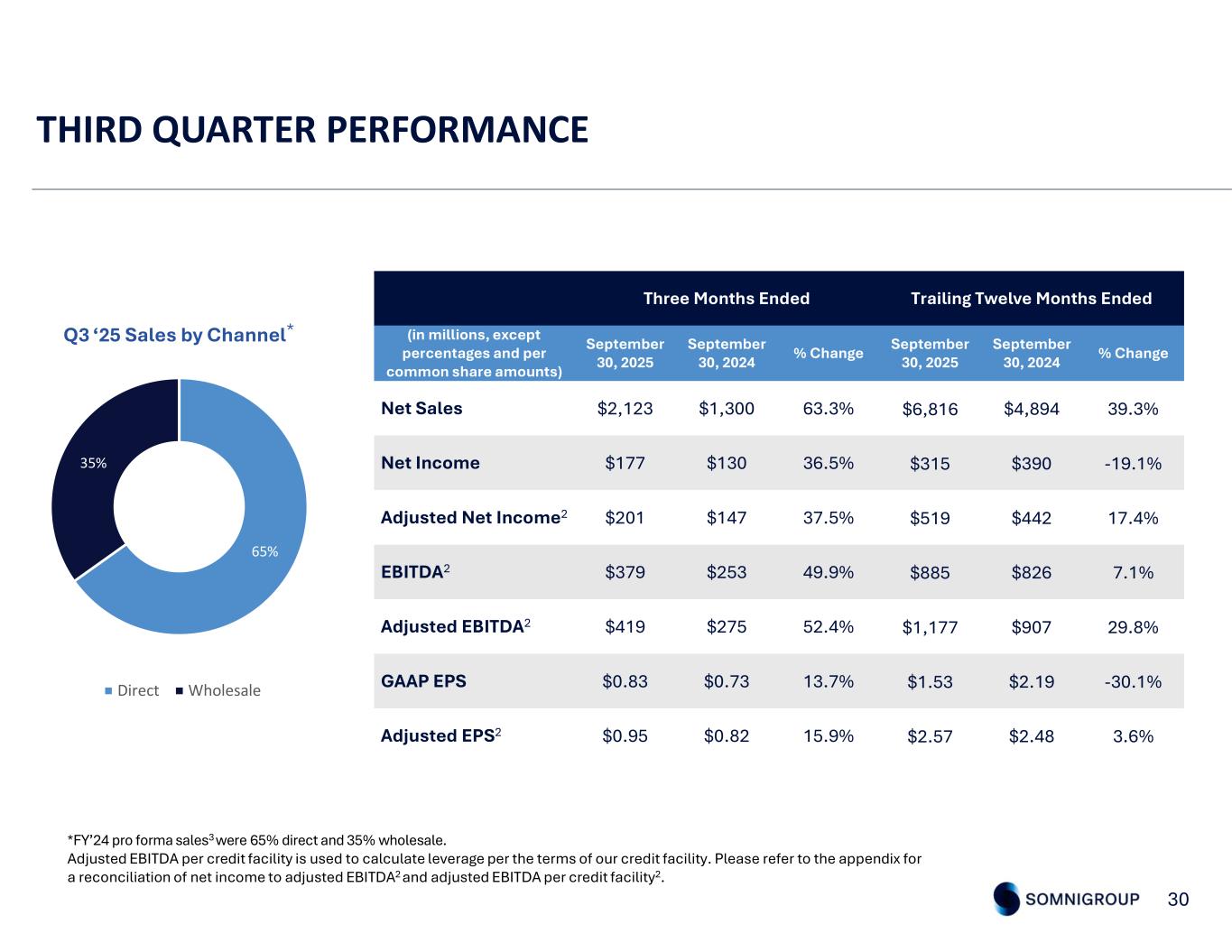 65% 35% Direct Wholesale THIRD QUARTER PERFORMANCE 30 Trailing Twelve Months EndedThree Months Ended % ChangeSeptember 30, 2024 September 30, 2025% ChangeSeptember 30, 2024 September 30, 2025 (in millions, except percentages and per common share amounts) 39.3%$4,894$6,81663.3%$1,300$2,123Net Sales -19.1%$390$31536.5%$130$177Net Income 17.4%$442$51937.5%$147$201Adjusted Net Income2 7.1%$826$88549.9%$253$379EBITDA2 29.8%$907$1,17752.4%$275$419Adjusted EBITDA2 -30.1%$2.19$1.5313.7%$0.73$0.83GAAP EPS 3.6%$2.48$2.5715.9%$0.82$0.95Adjusted EPS2 Q3 ‘25 Sales by Channel* *FY’24 pro forma sales3 were 65% direct and 35% wholesale. Adjusted EBITDA per credit facility is used to calculate leverage per the terms of our credit facility. Please refer to the appendix for a reconciliation of net income to adjusted EBITDA2 and adjusted EBITDA per credit facility2.