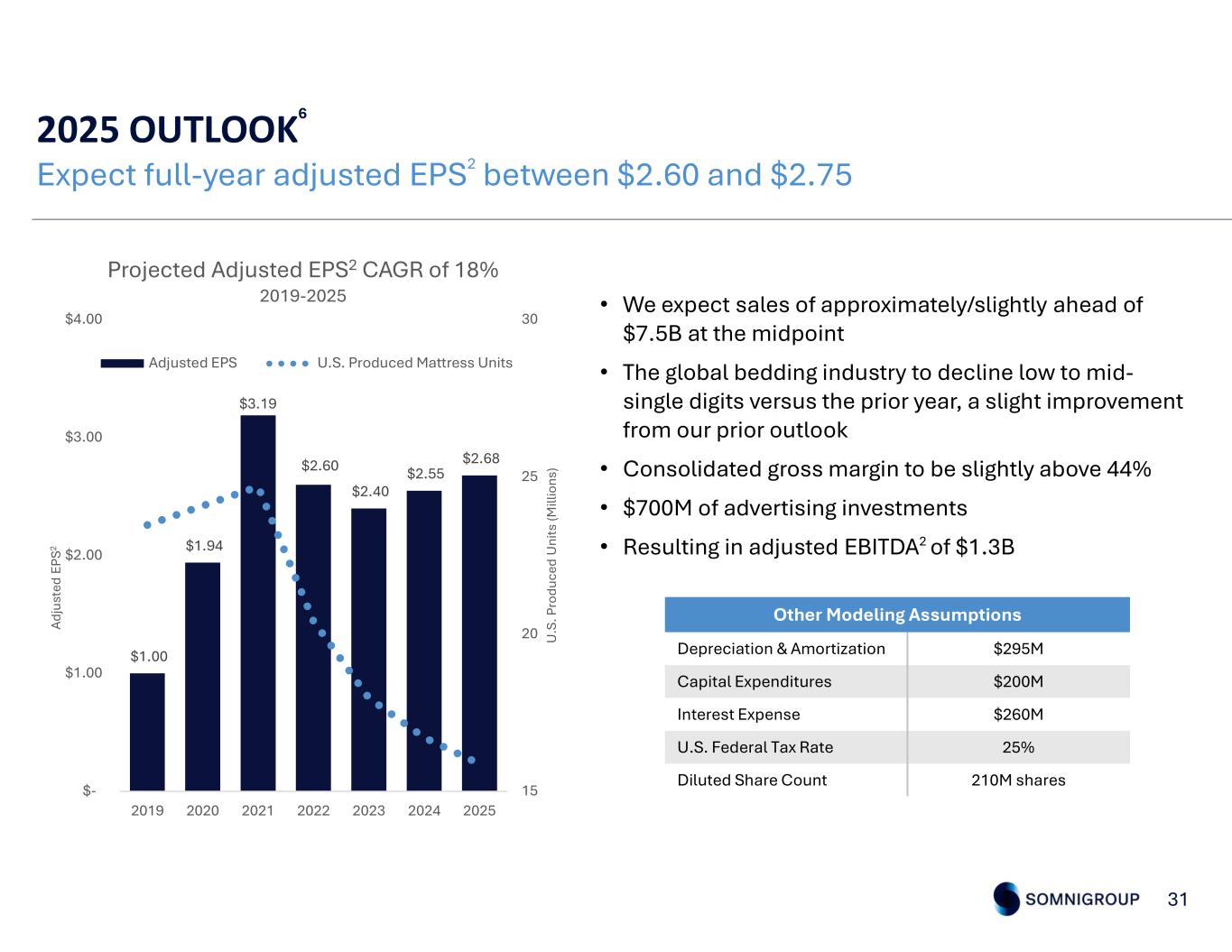 2025 OUTLOOK6 31 Expect full-year adjusted EPS2 between $2.60 and $2.75 Other Modeling Assumptions $295MDepreciation & Amortization $200MCapital Expenditures $260MInterest Expense 25%U.S. Federal Tax Rate 210M sharesDiluted Share Count • We expect sales of approximately/slightly ahead of $7.5B at the midpoint • The global bedding industry to decline low to mid- single digits versus the prior year, a slight improvement from our prior outlook • Consolidated gross margin to be slightly above 44% • $700M of advertising investments • Resulting in adjusted EBITDA2 of $1.3B $1.00 $1.94 $3.19 $2.60 $2.40 $2.55 $2.68 15 20 25 30 $- $1.00 $2.00 $3.00 $4.00 2019 2020 2021 2022 2023 2024 2025 U .S . P ro du ce d U ni ts (M ill io ns ) Ad ju st ed E PS 2 Projected Adjusted EPS2 CAGR of 18% 2019-2025 Adjusted EPS U.S. Produced Mattress Units